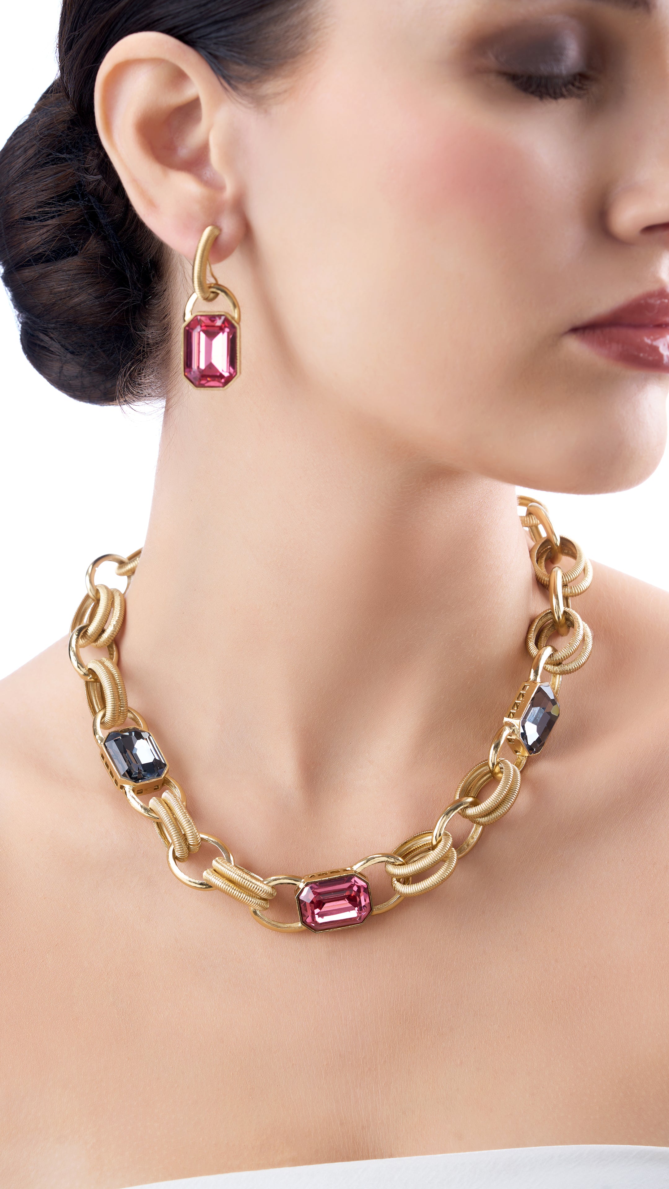 Striking modern box chain necklace set, accented with semi-precious stones, perfect for adding a pop of color and elegance to any look.