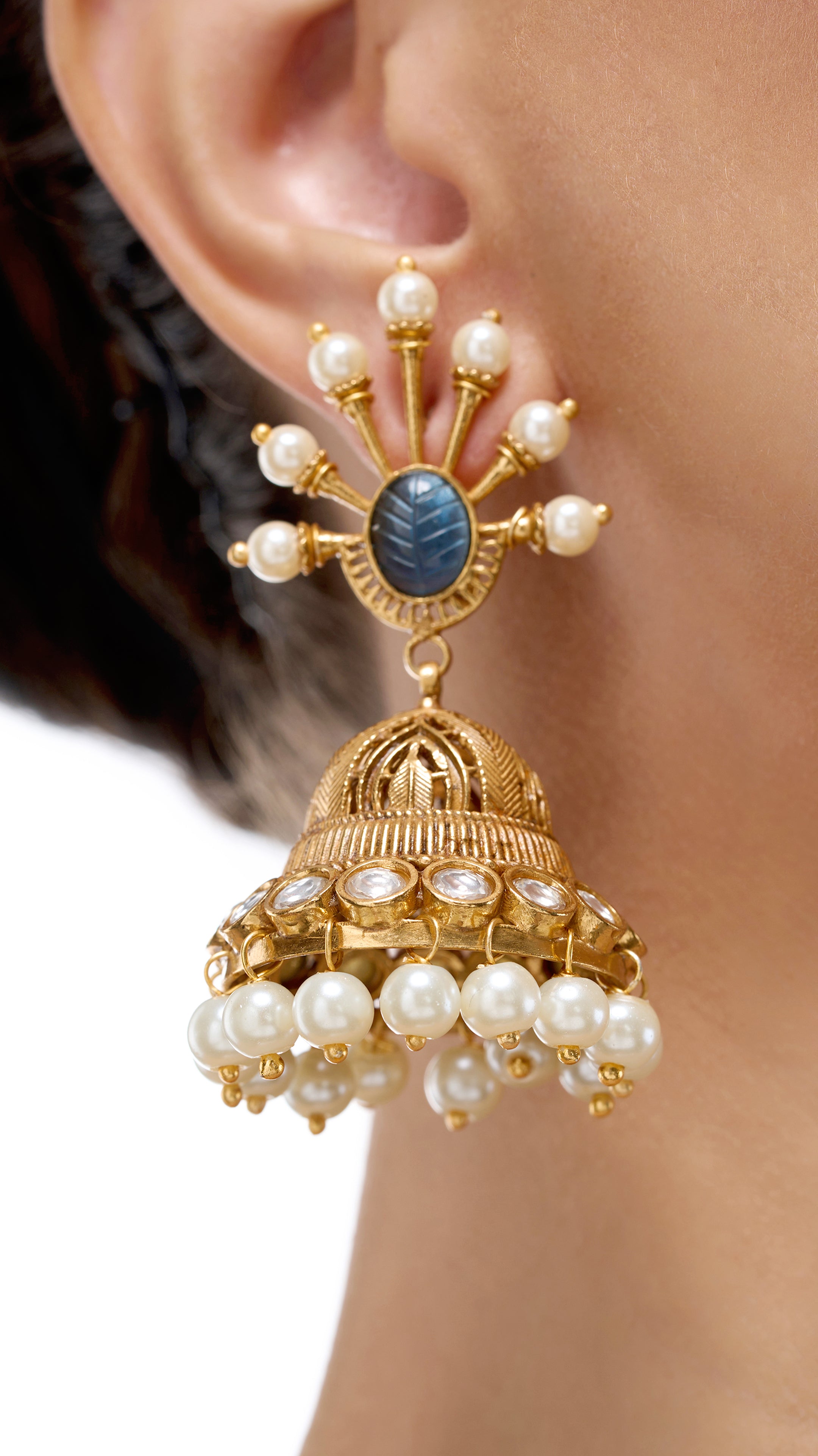 Gold Foil Filigree Jhumki with Pearls—a perfect fusion of intricate design and timeless elegance. These jhumkis feature delicate gold foil filigree work that adds a touch of opulence, beautifully complemented by classic pearls. The elegant combination creates a refined and sophisticated look, making these earrings ideal for special occasions or enhancing any outfit with a touch of grace and charm.