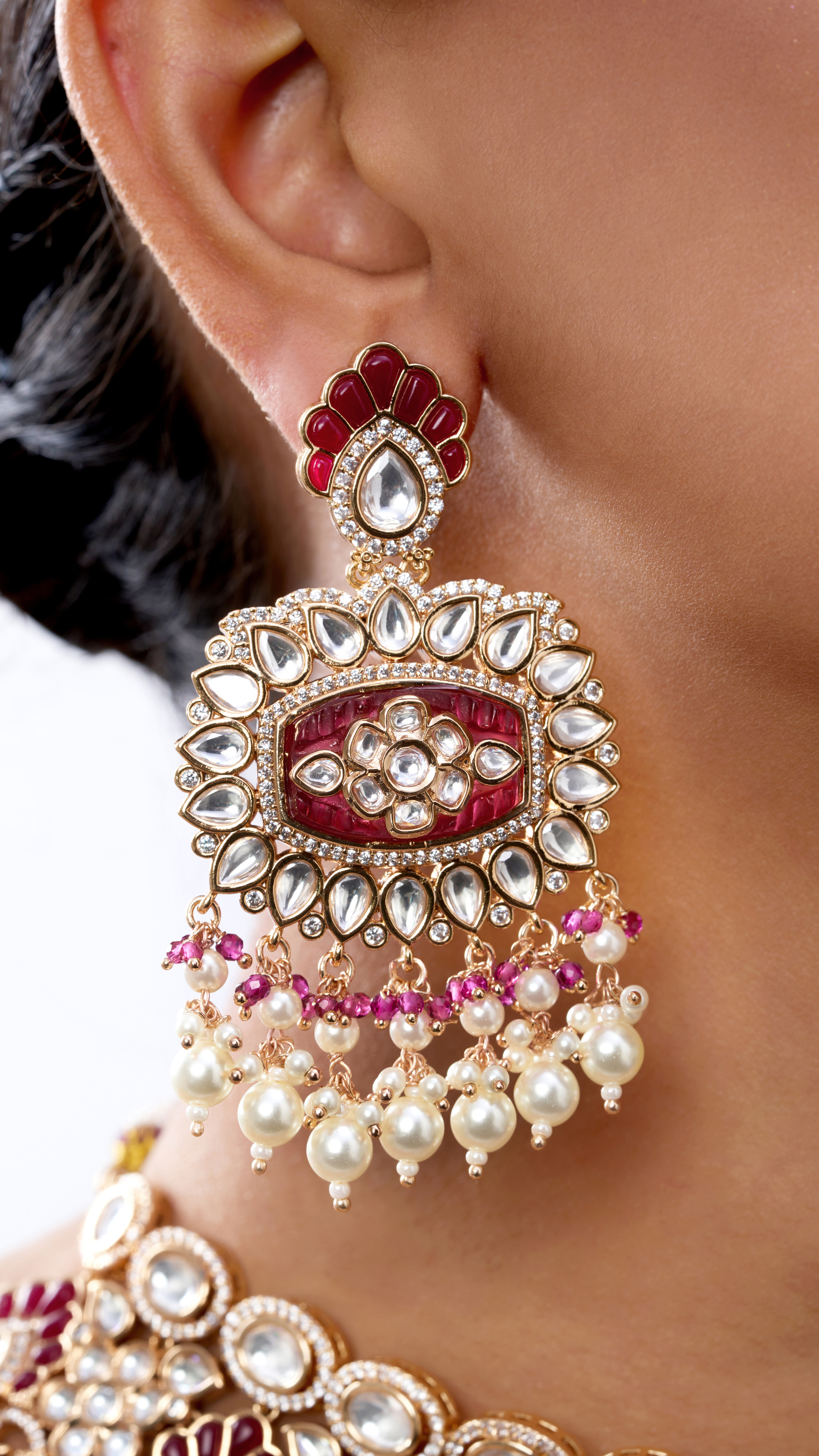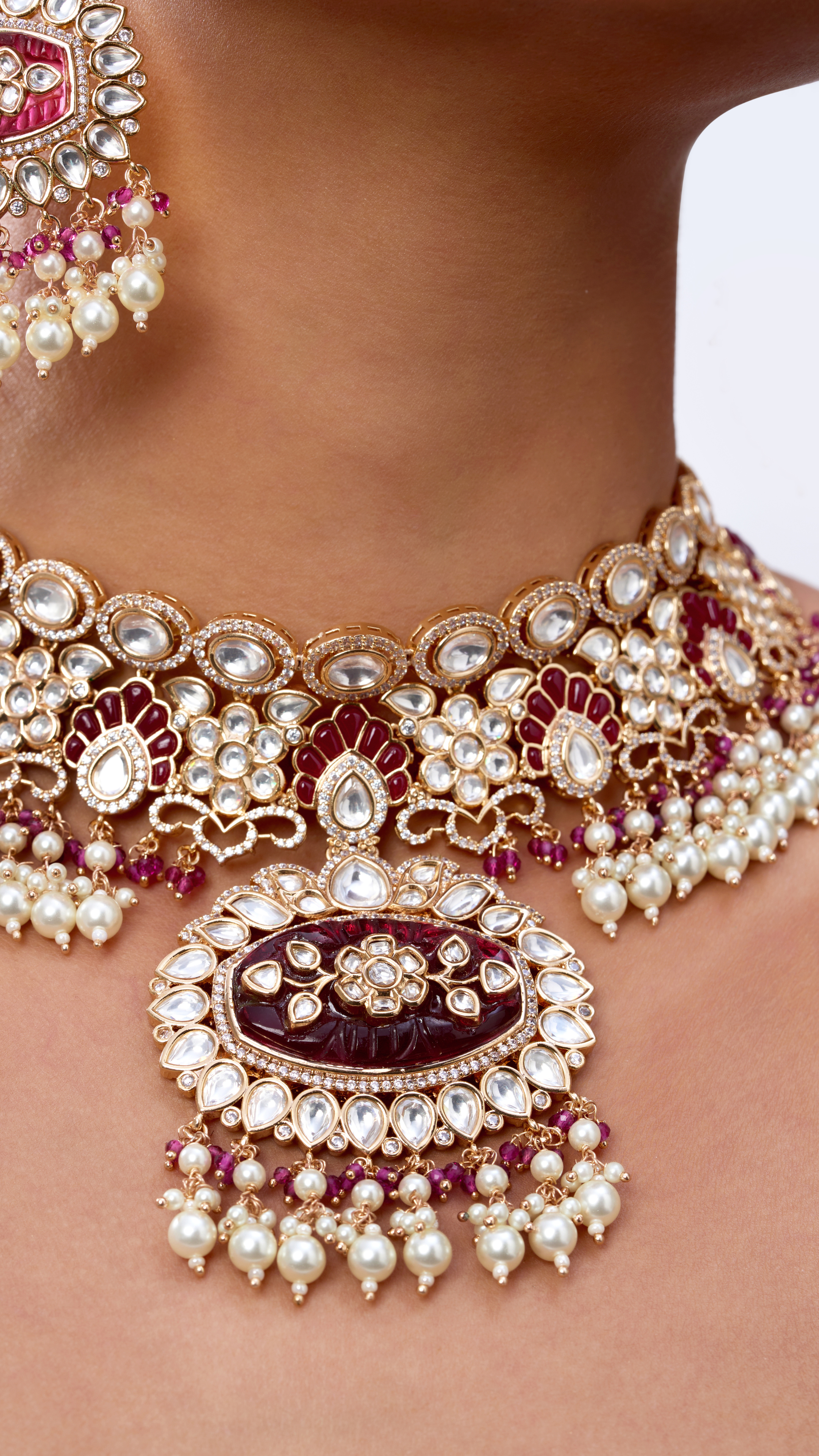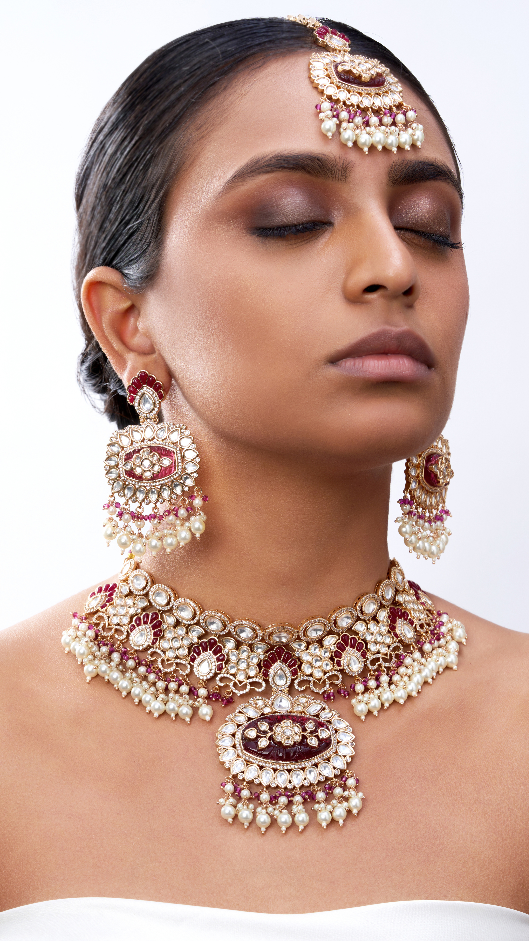 Discover the perfect combination of effortless elegance and lightweight luxury with our Ruby & Polki Set. Handcrafted to make an impactful statement, this set features stunning rubies and polished polki that are sure to add a touch of glamour to any outfit. Elevate your style with this one-of-a-kind piece.