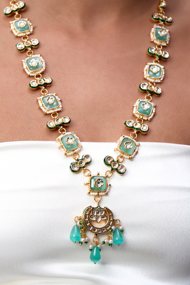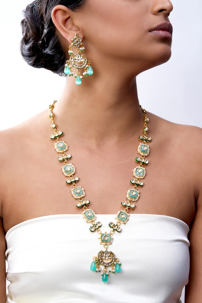 Add a touch of luxury to your wardrobe with our Prismatic Kundan Ensemble. Hand-crafted with intricate detailing and adorned with multi pure stones, this ensemble exudes elegance and sophistication. Elevate any outfit with the timeless beauty of Kundan and the vibrant energy of multi pure stones.