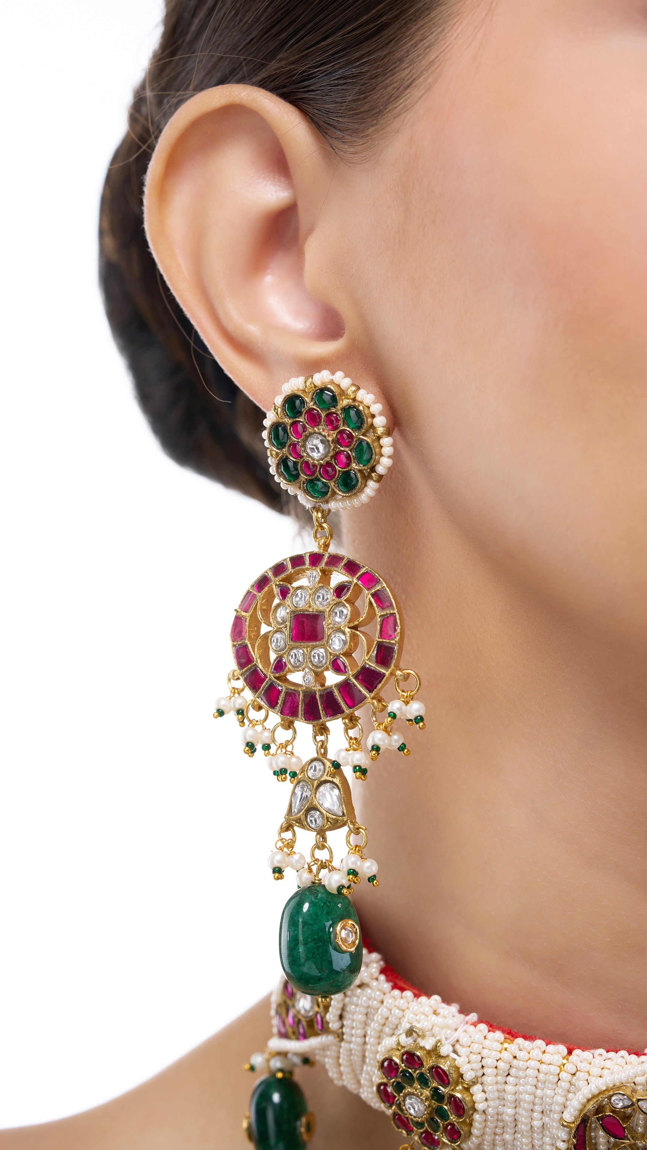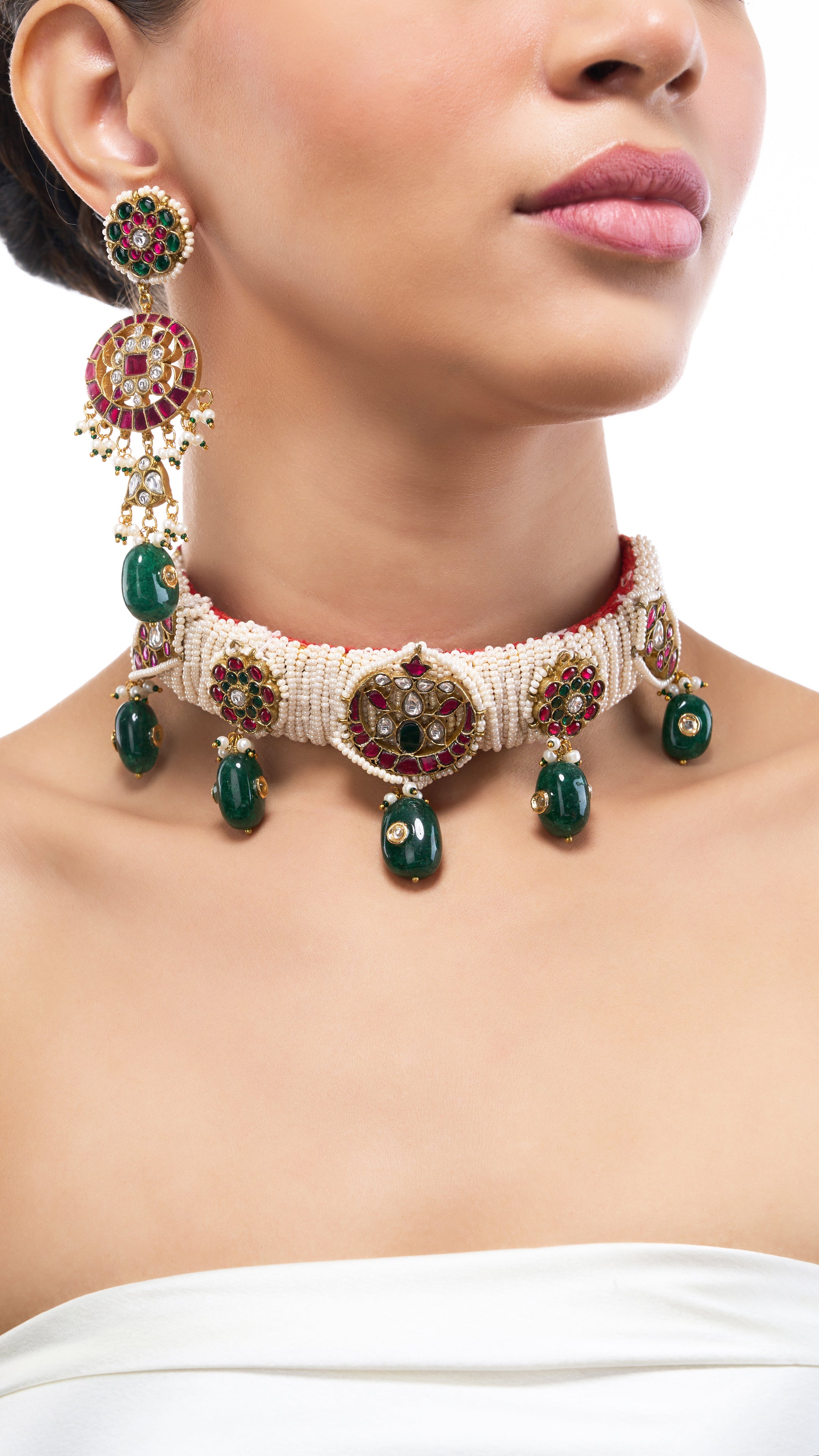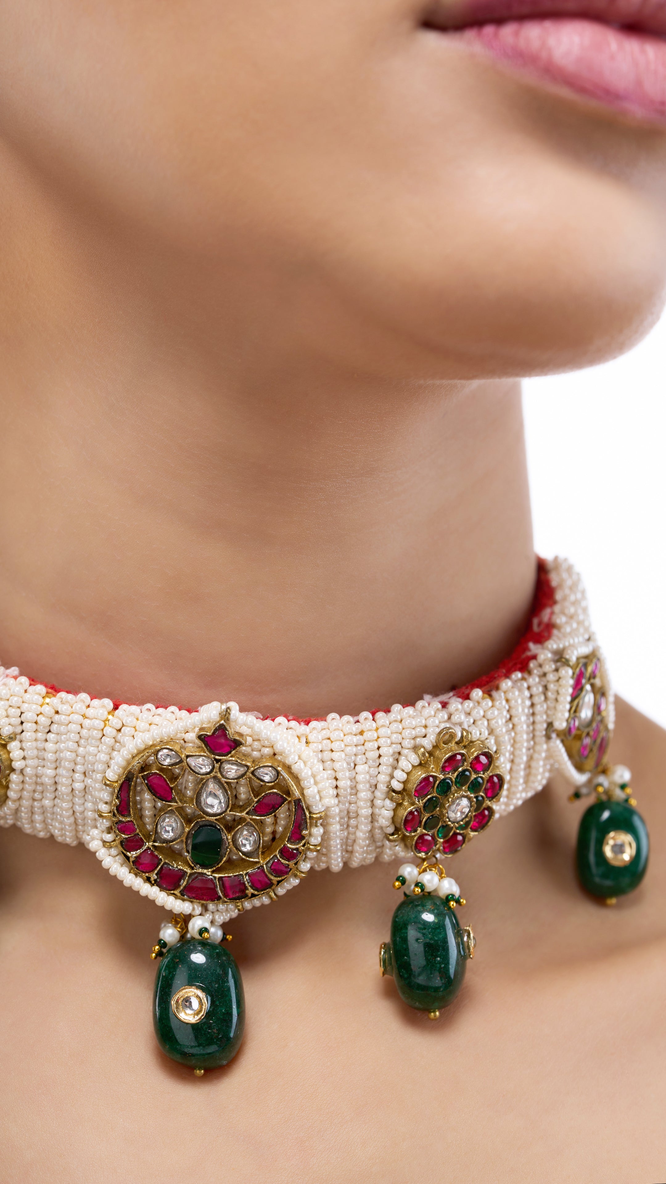 A symphony of elegance, this hand-engraved pearl choker dances with vibrant semi-precious stones, capturing the essence of nature’s beauty.