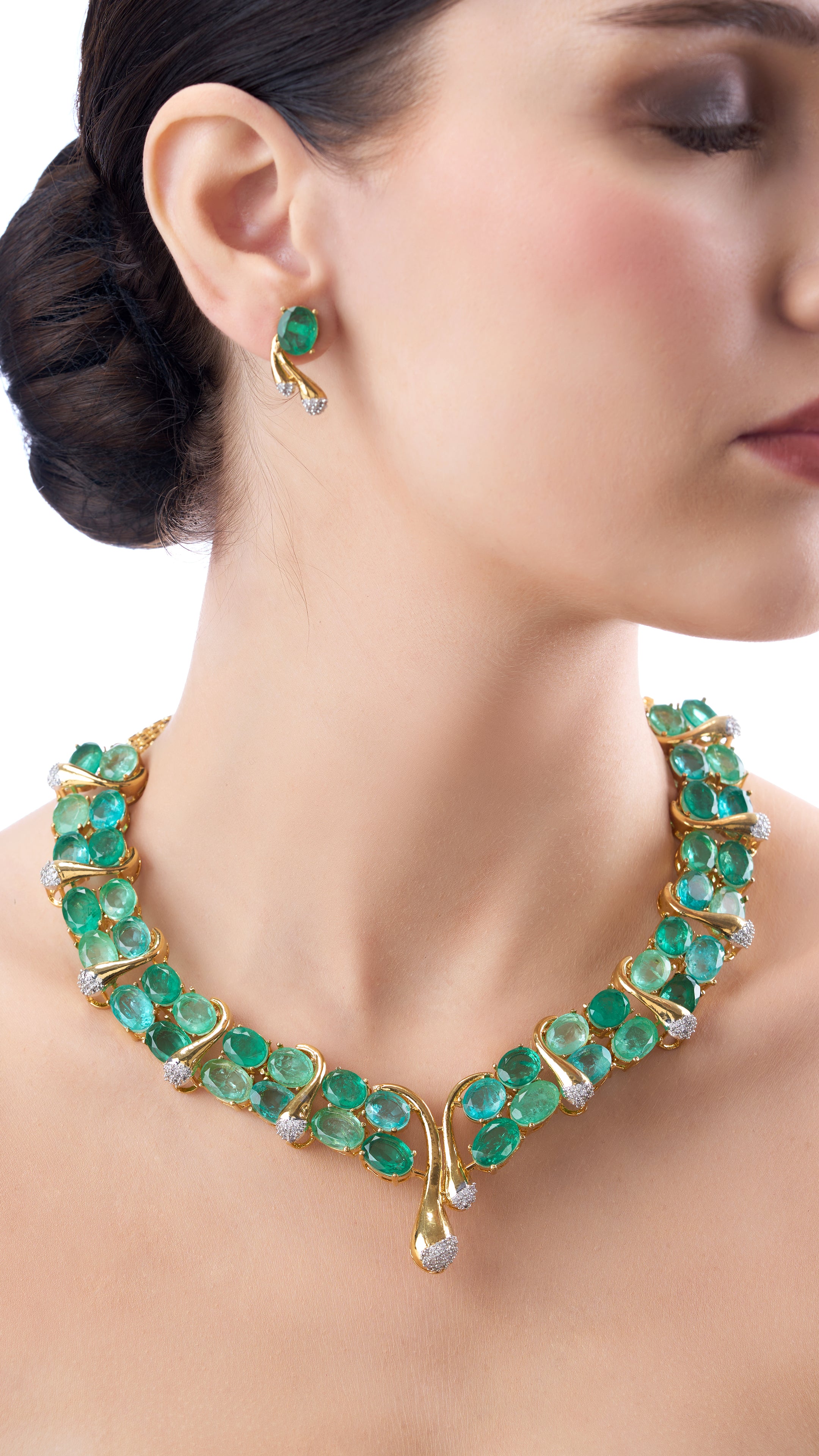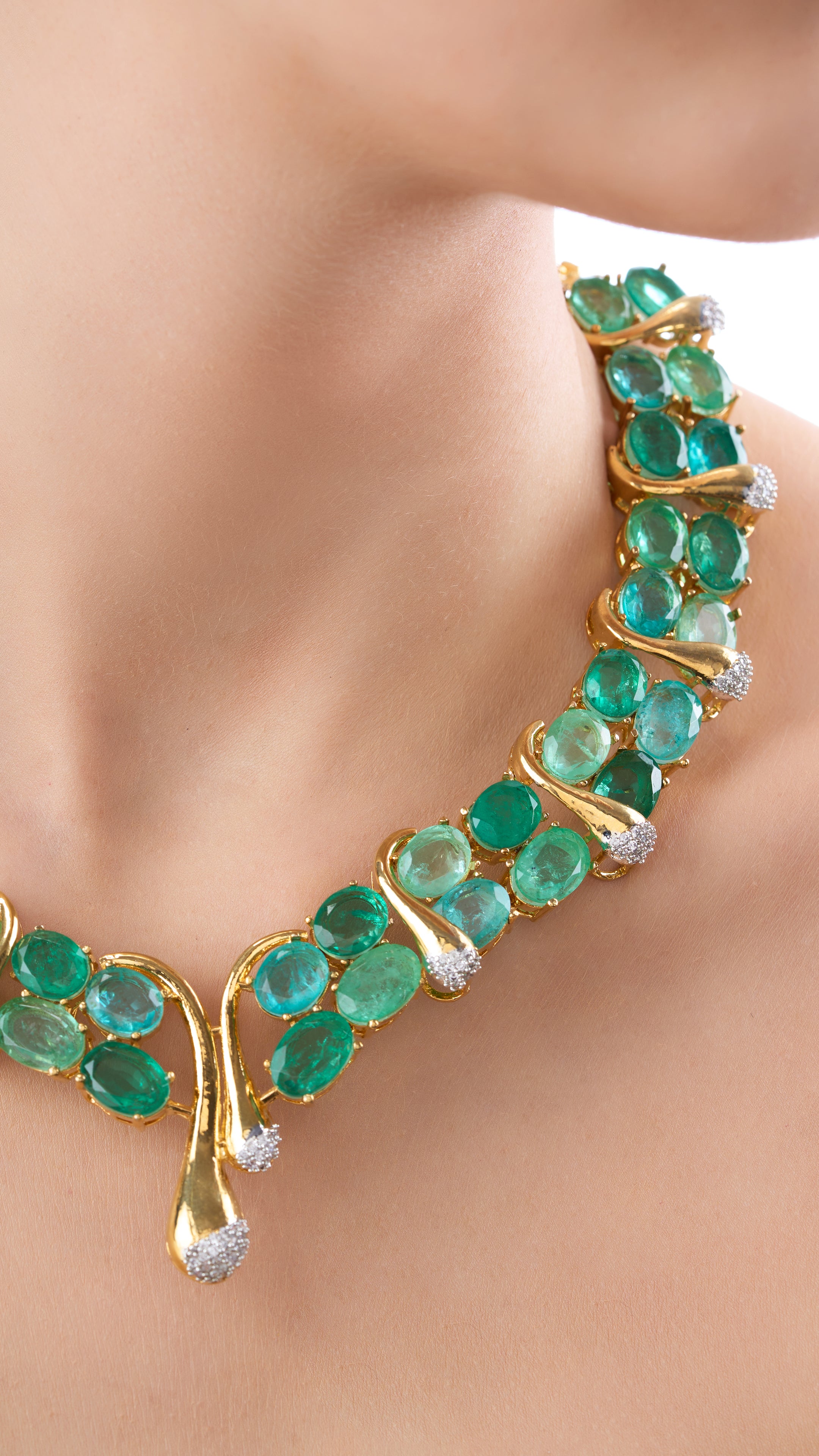Elegant necklace set featuring semi precious aqua stones and mossainites, blending serene hues with graceful design for a refined look