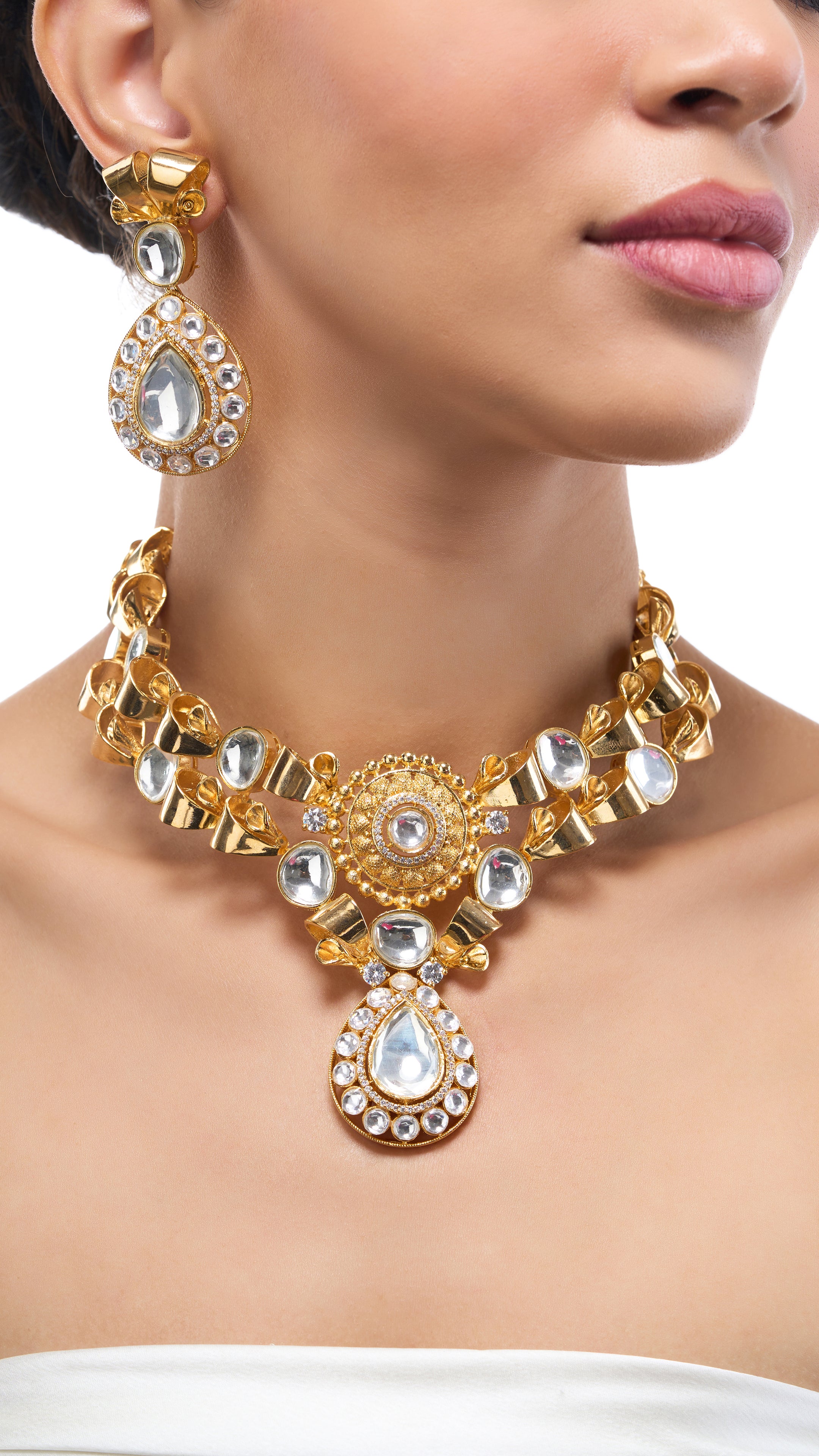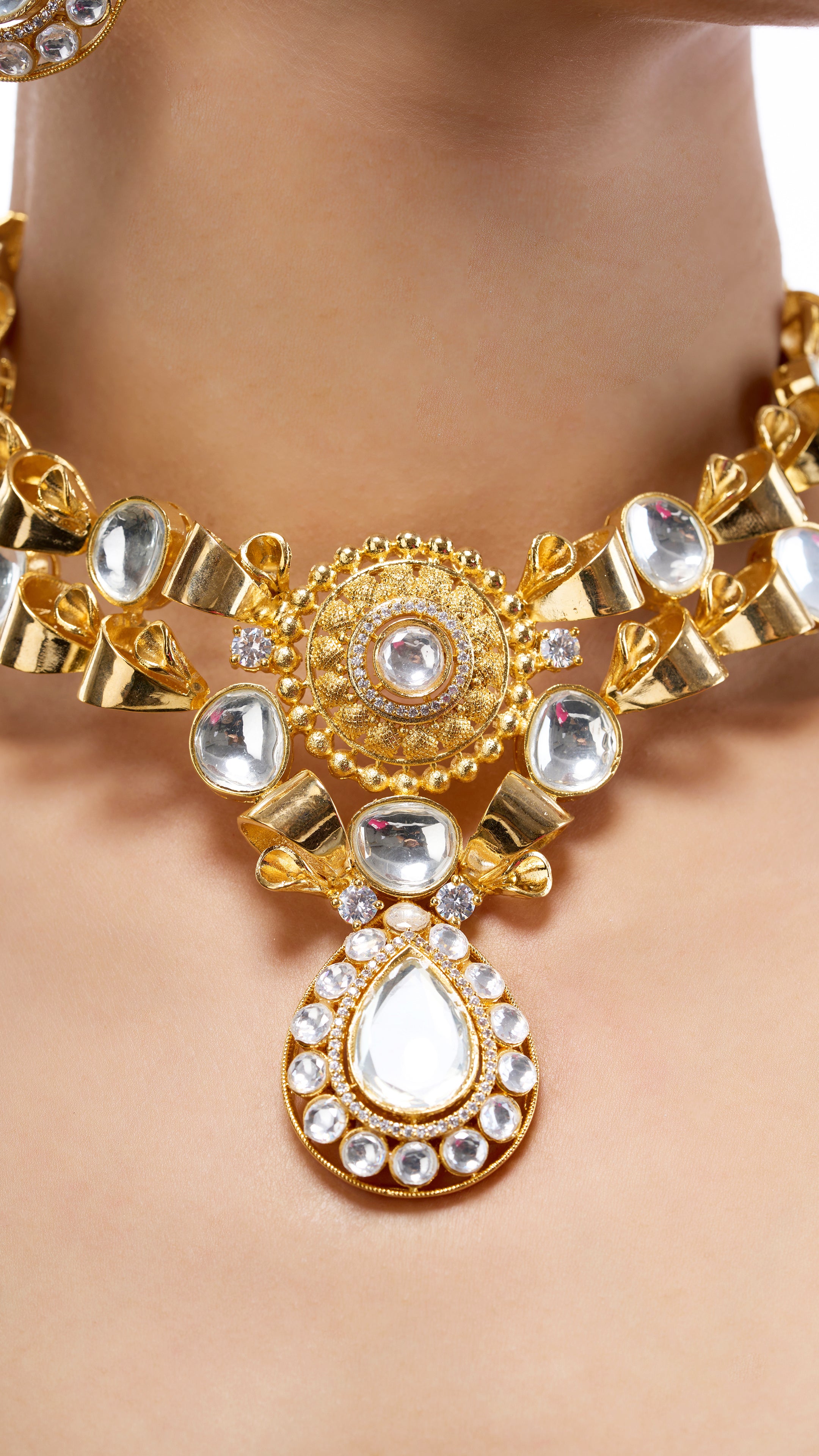 Exquisite gold foil double-layer necklace featuring intricate filigree and Polki stones, merging traditional craftsmanship with a modern, elegant design.