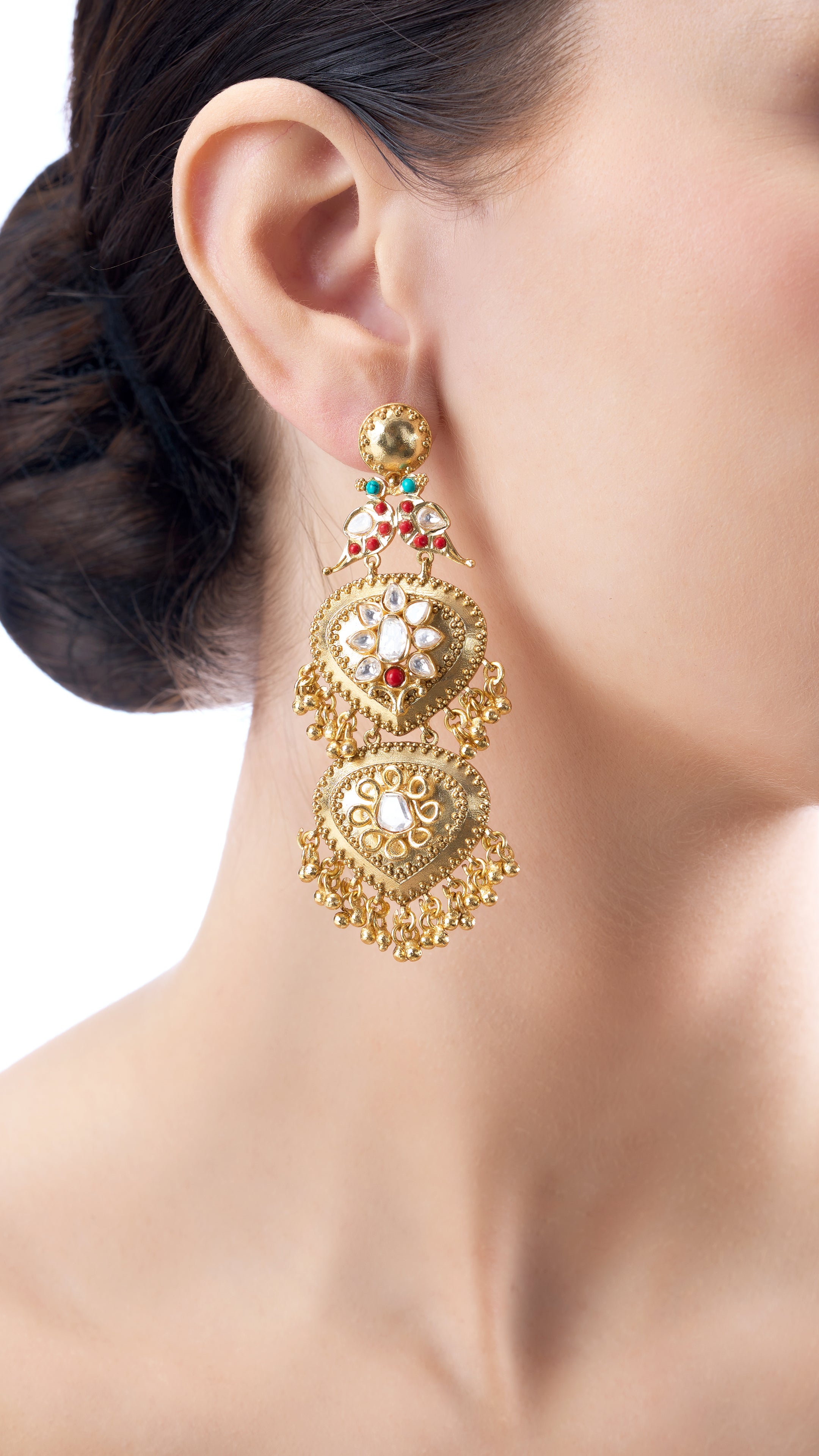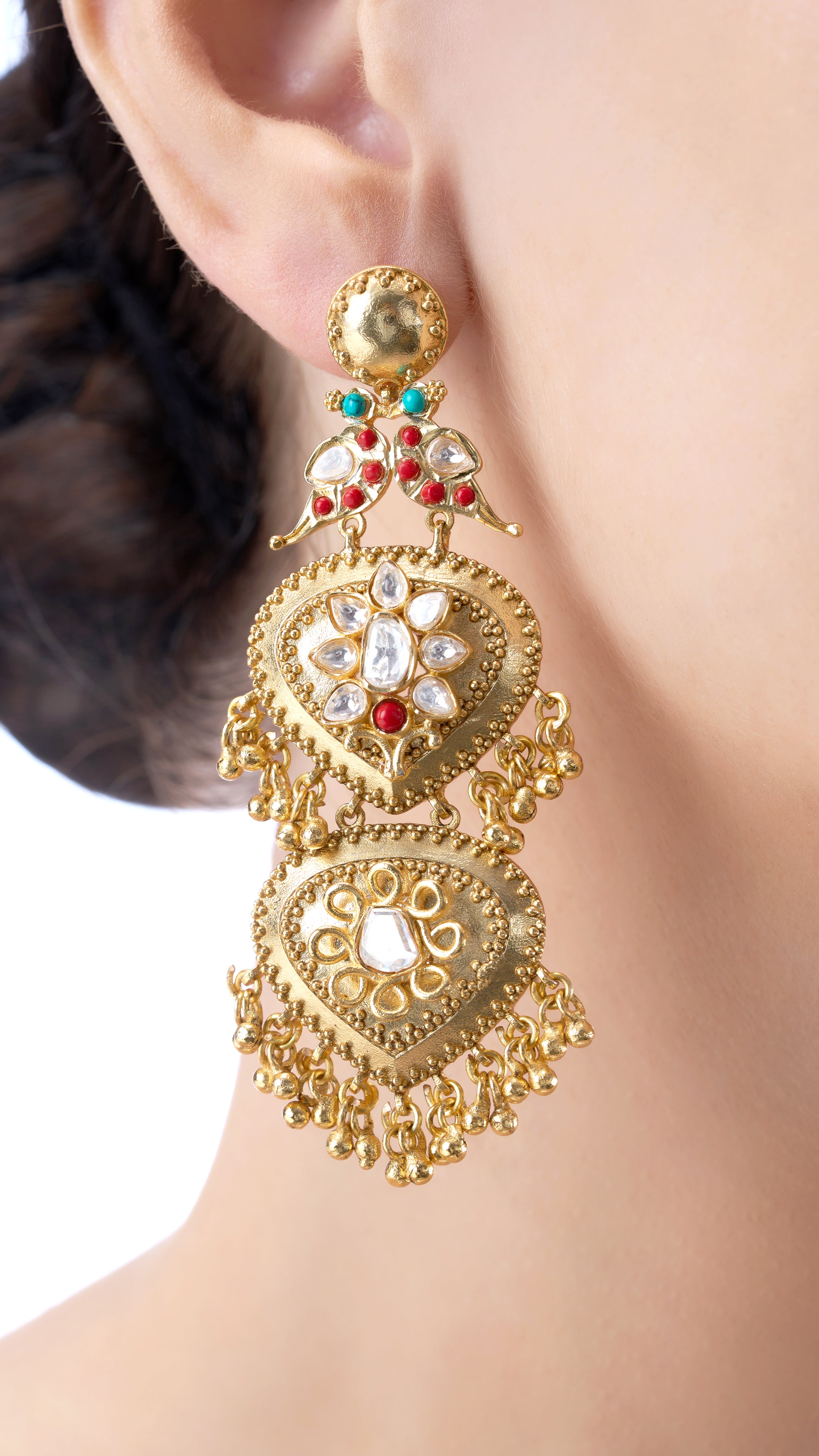 Exquisite double leaf peacock earrings featuring red and firoza semi-precious stones, embellished with intricate kundan work for a vibrant, luxurious look.