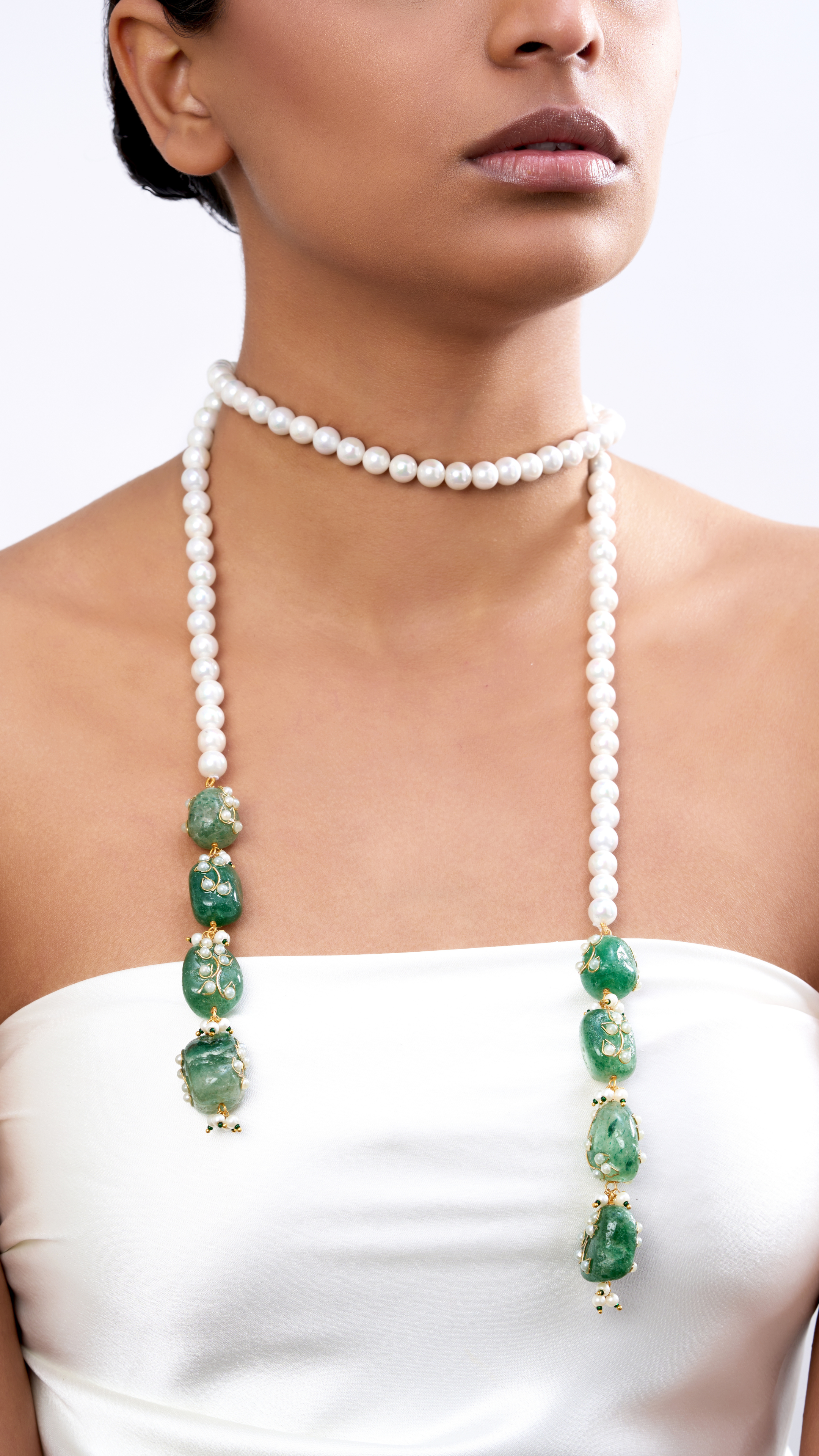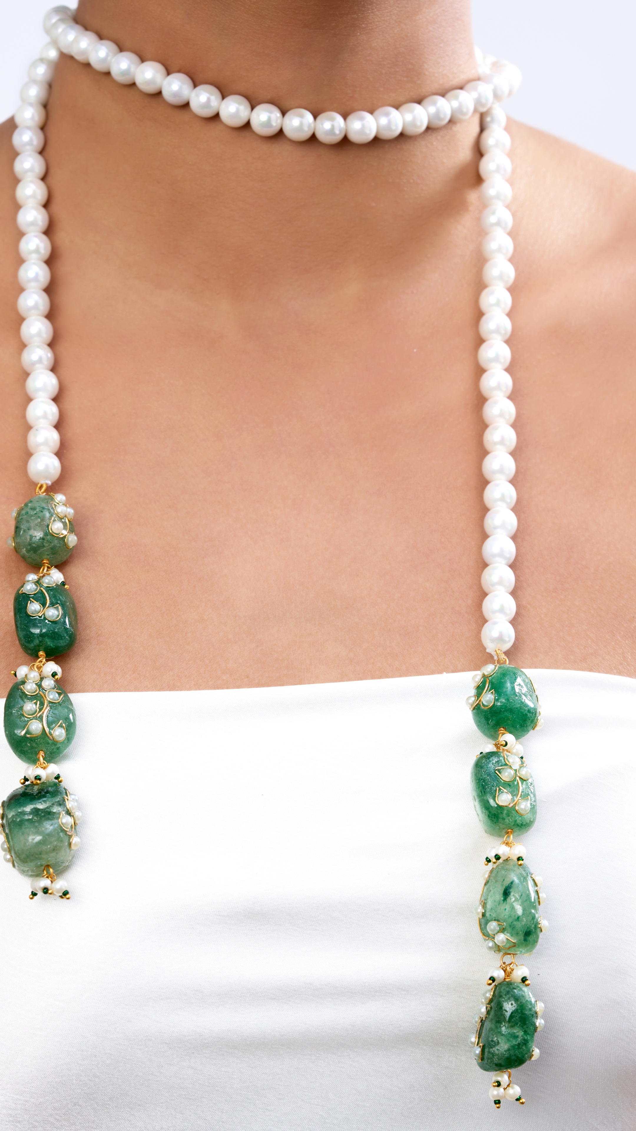 Zara pearl & pure stone hand engraved scarf necklace- green