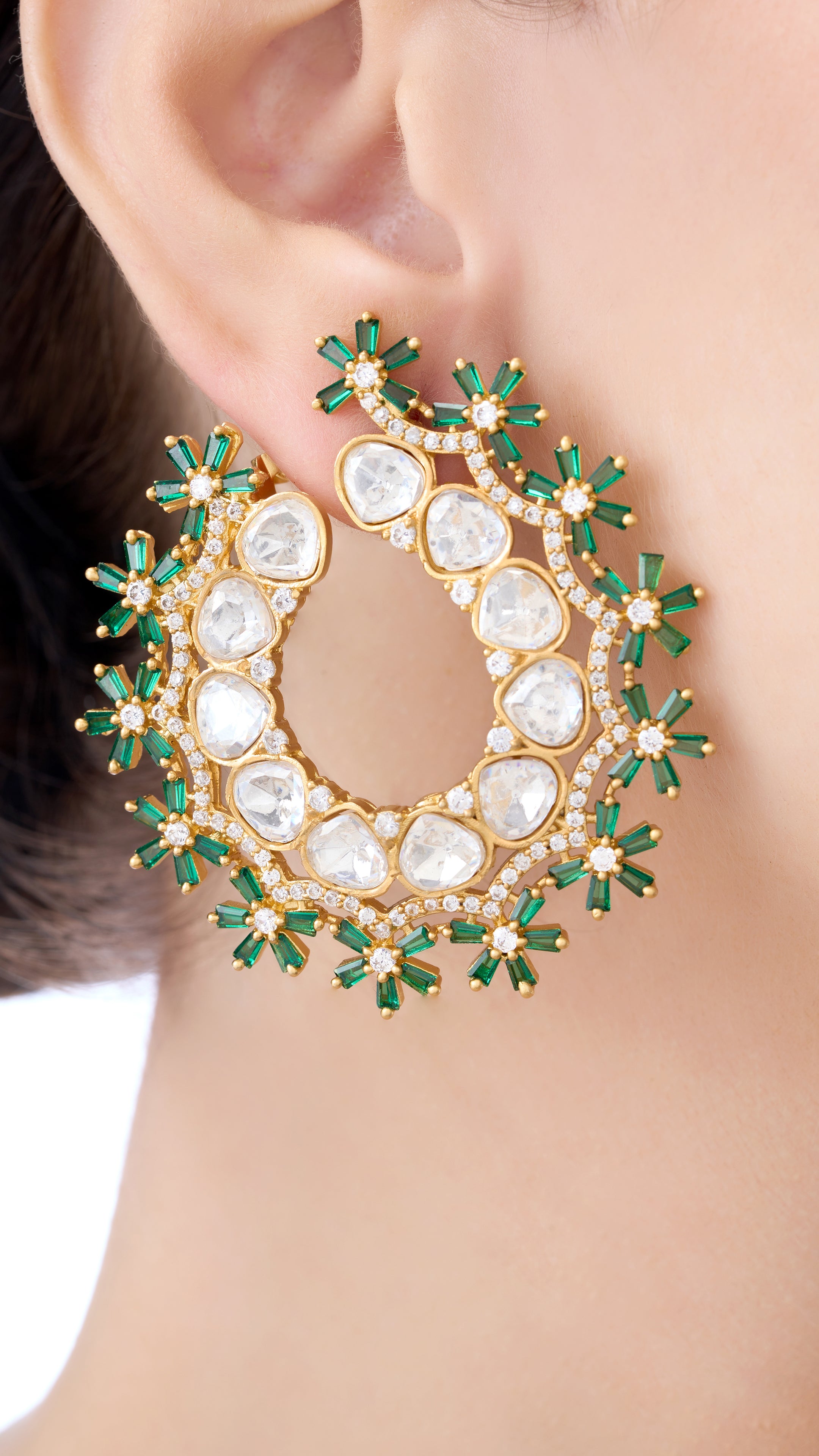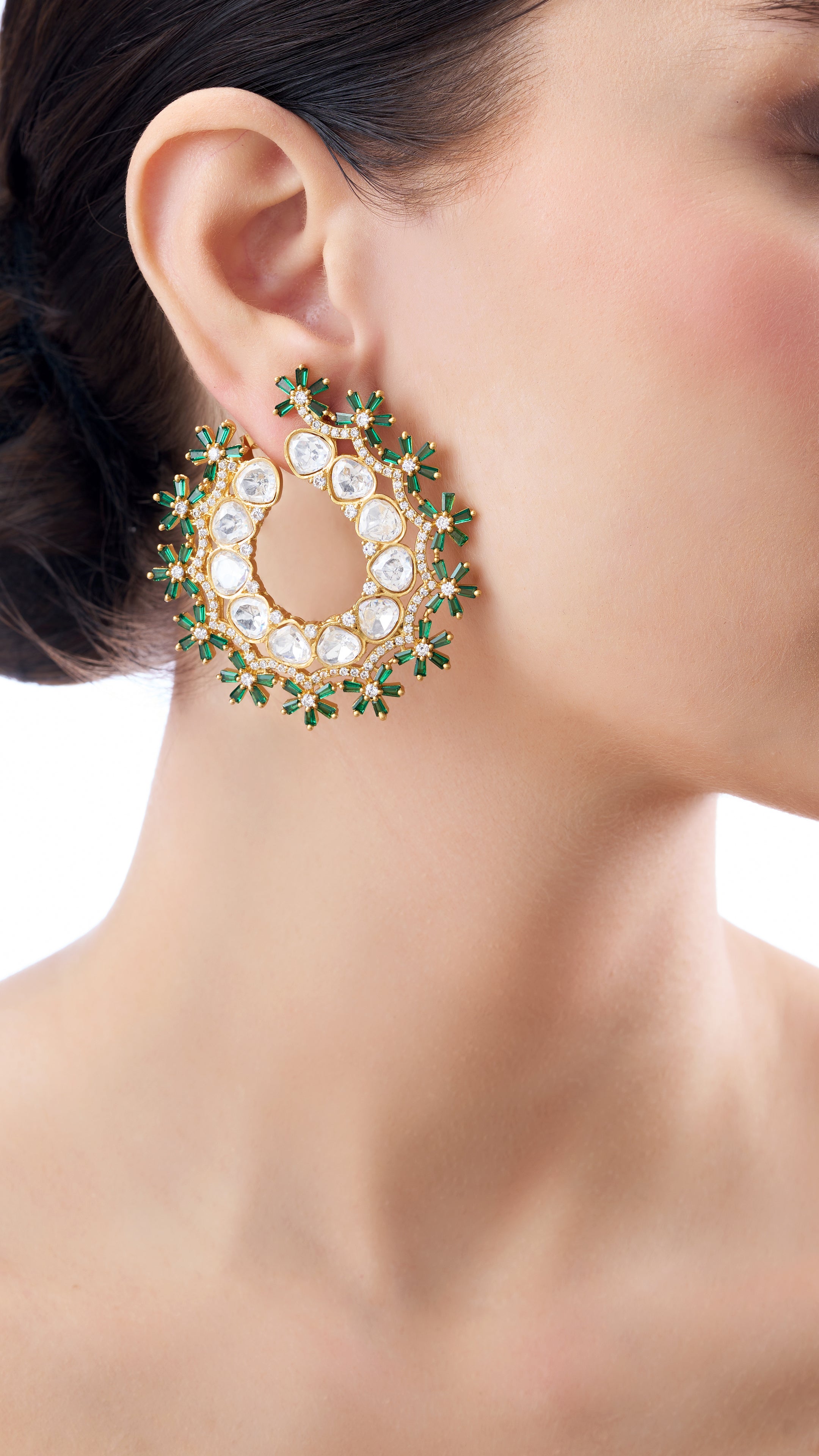 Two-side openable Chandbali earrings are adorned with striking green semi-precious stones, showcasing a sophisticated design that offers both elegance and flexibility. Ideal for adding a refined, contemporary twist to traditional style.