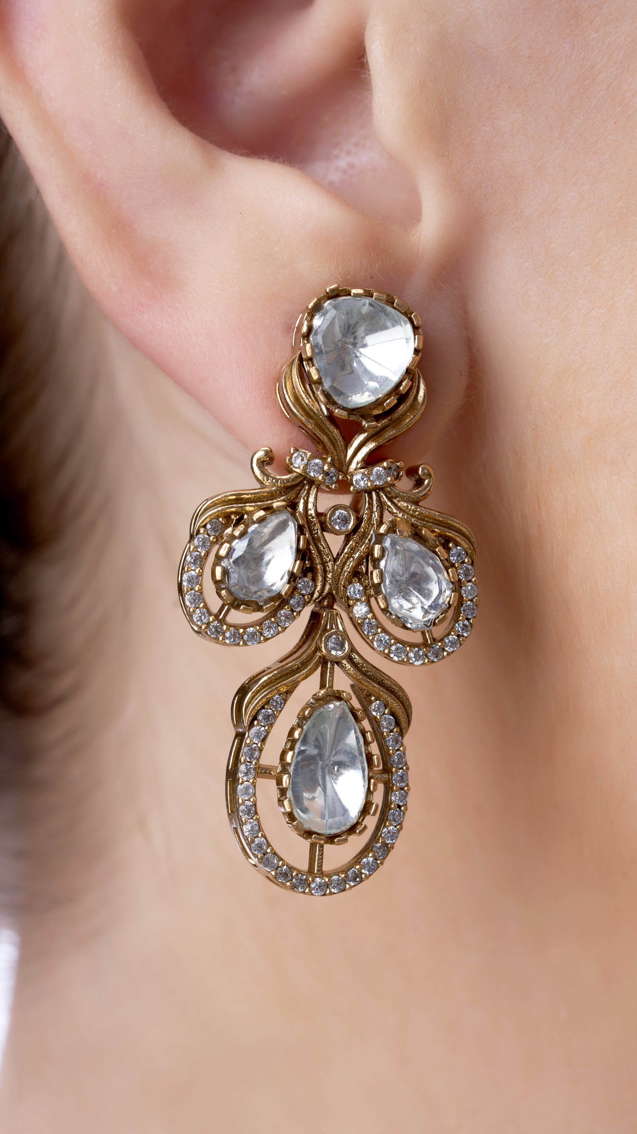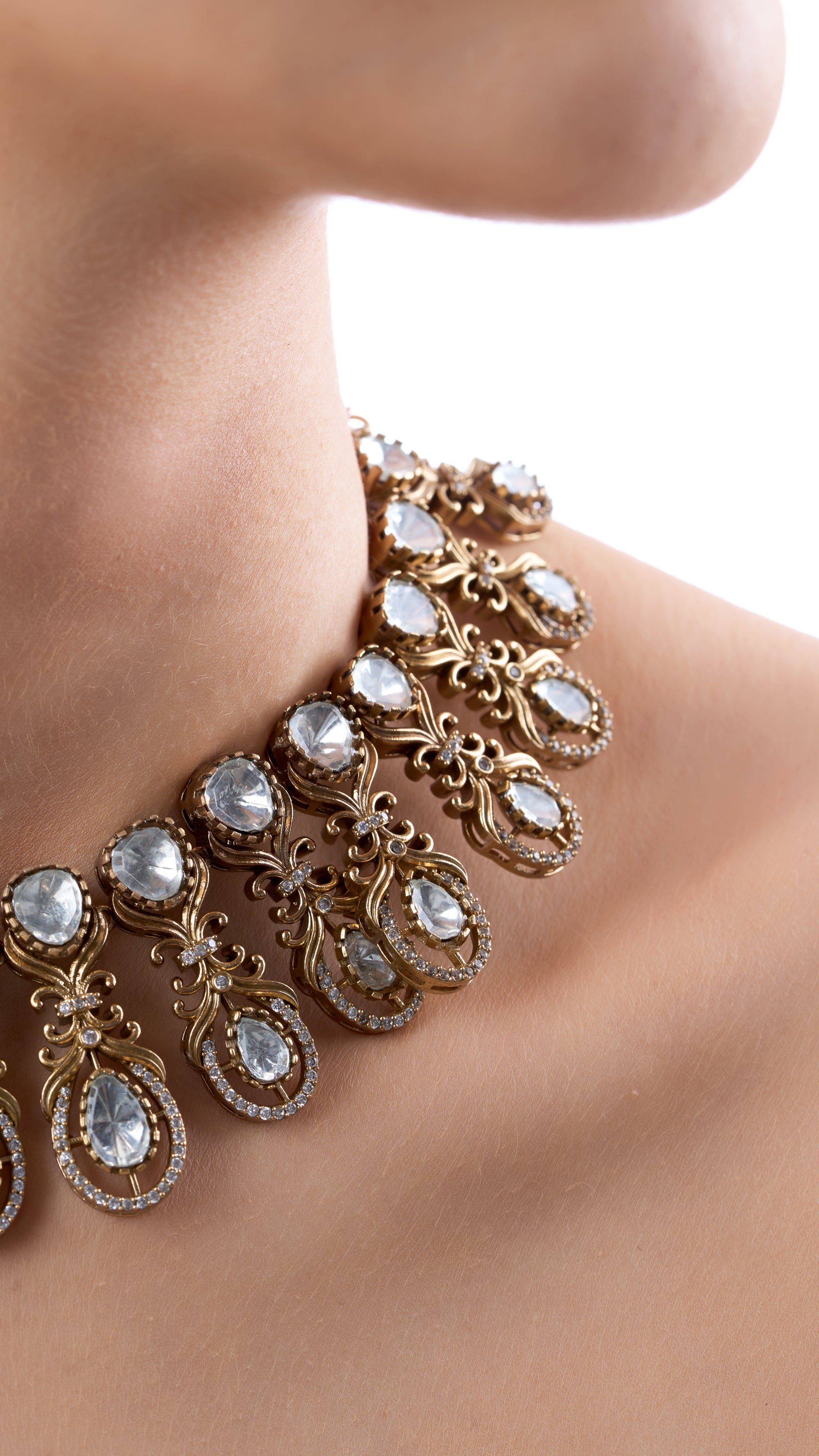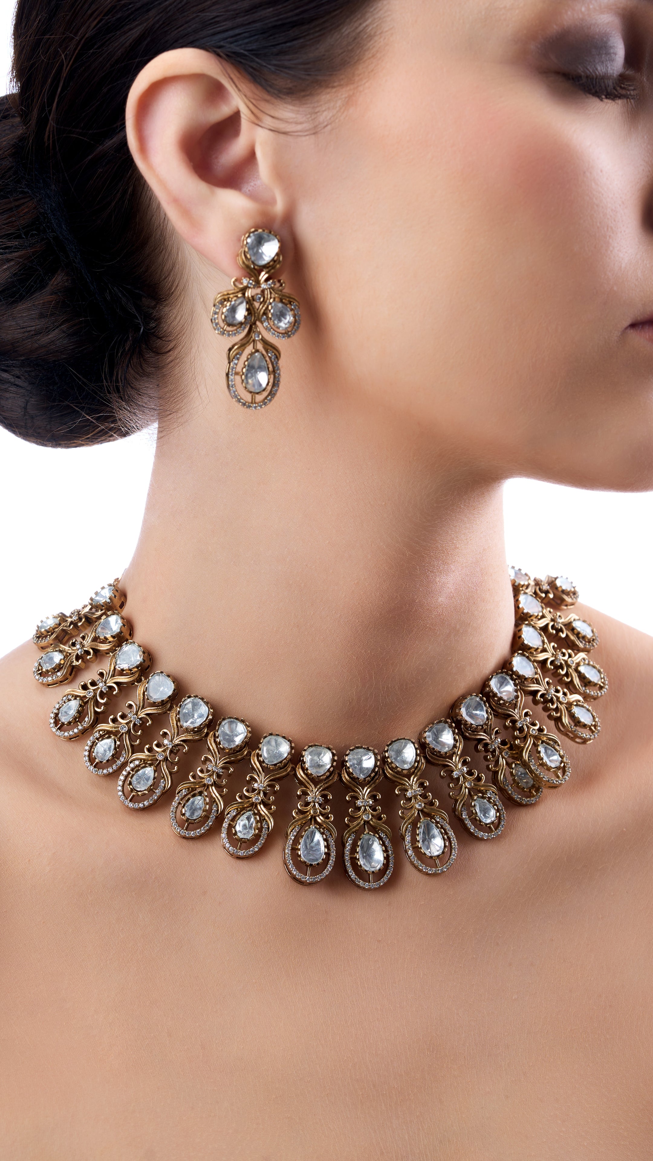 Semi-precious antique gold Kundan necklace set showcases intricate craftsmanship, with vibrant stones and a regal, vintage-inspired design.
