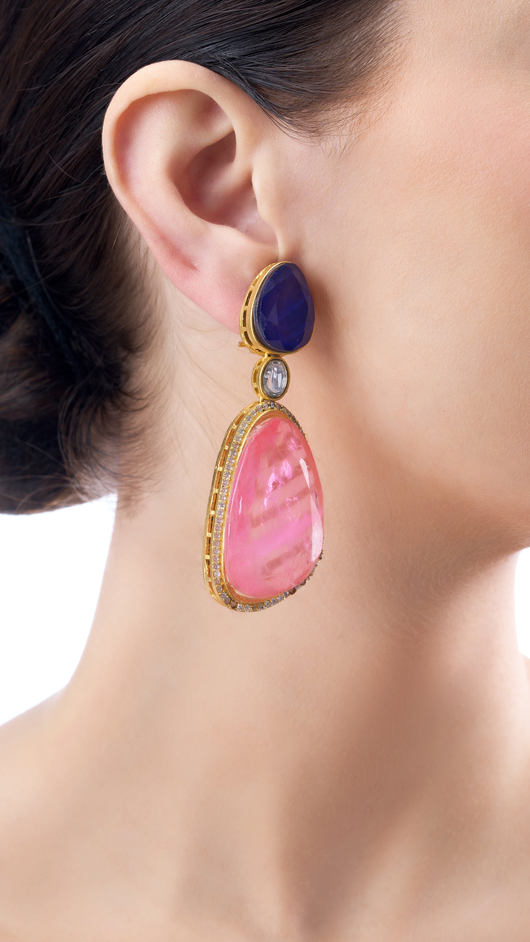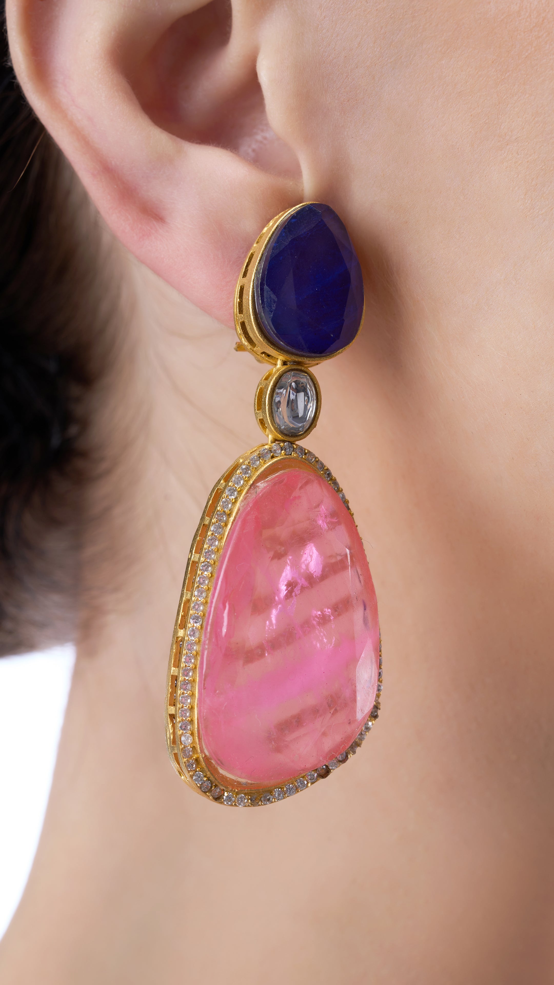 Statement double-stone earrings, featuring Quartz and blue semi-precious stones, create a bold contrast of shimmering elegance and vibrant color.