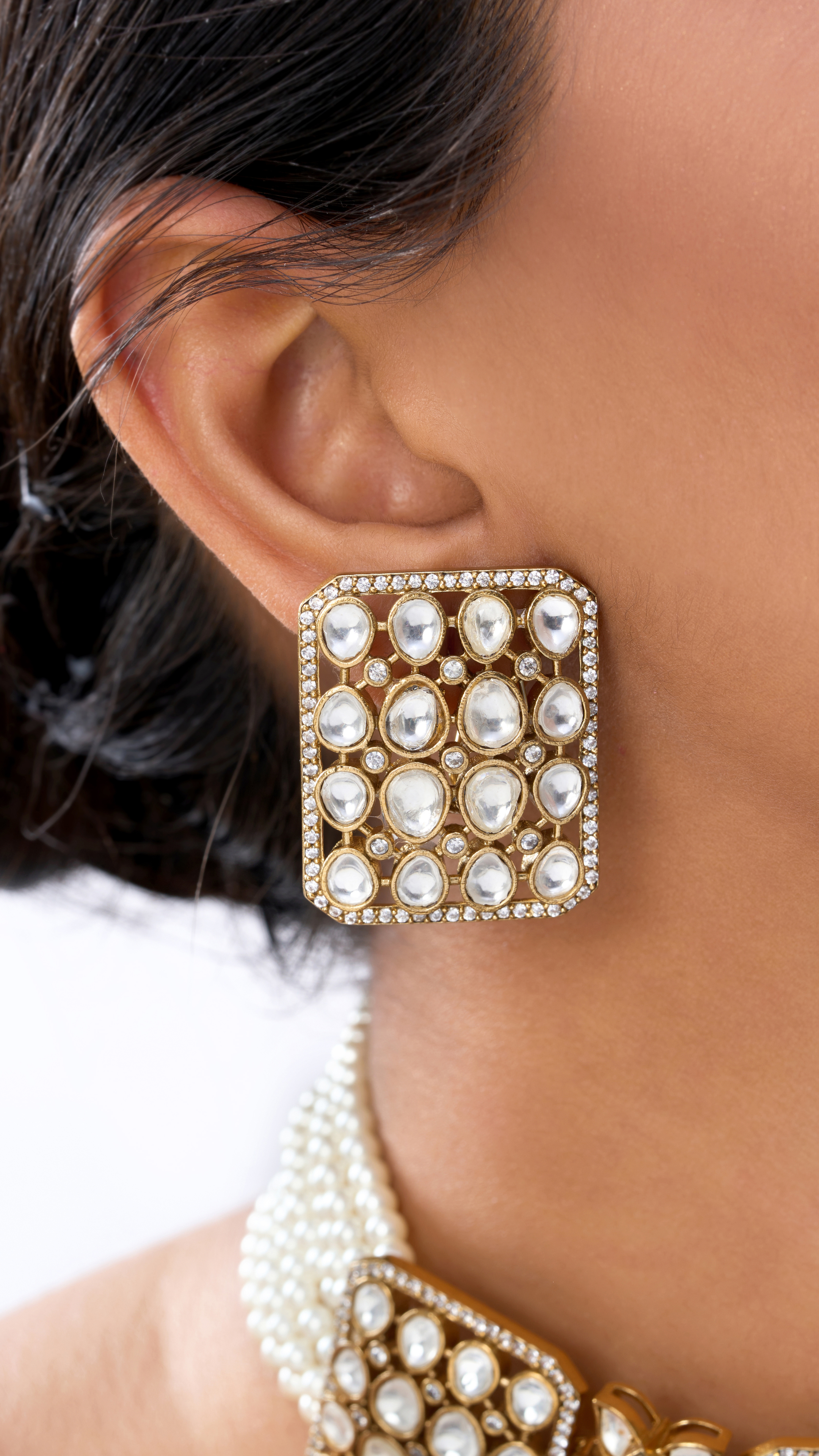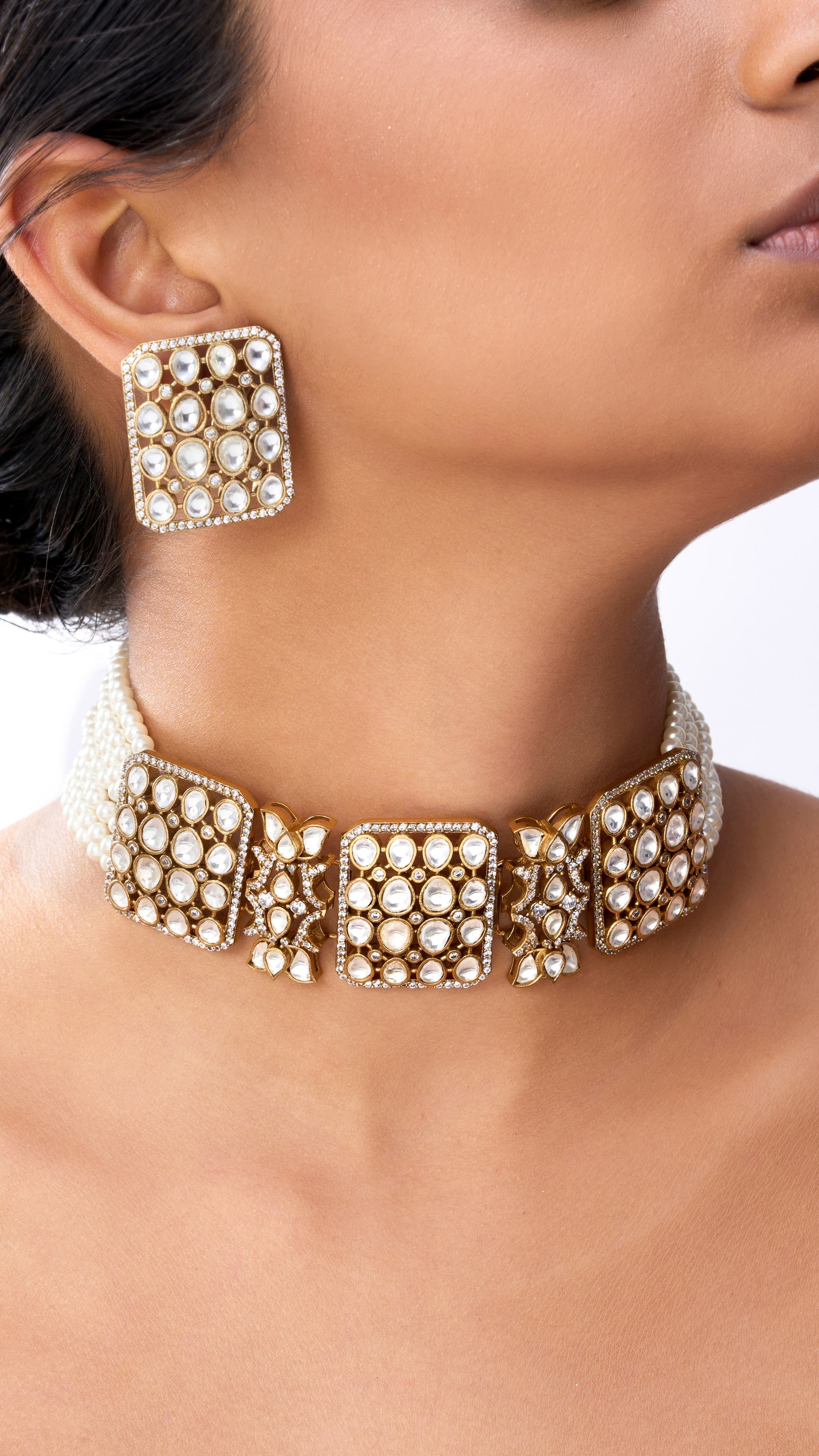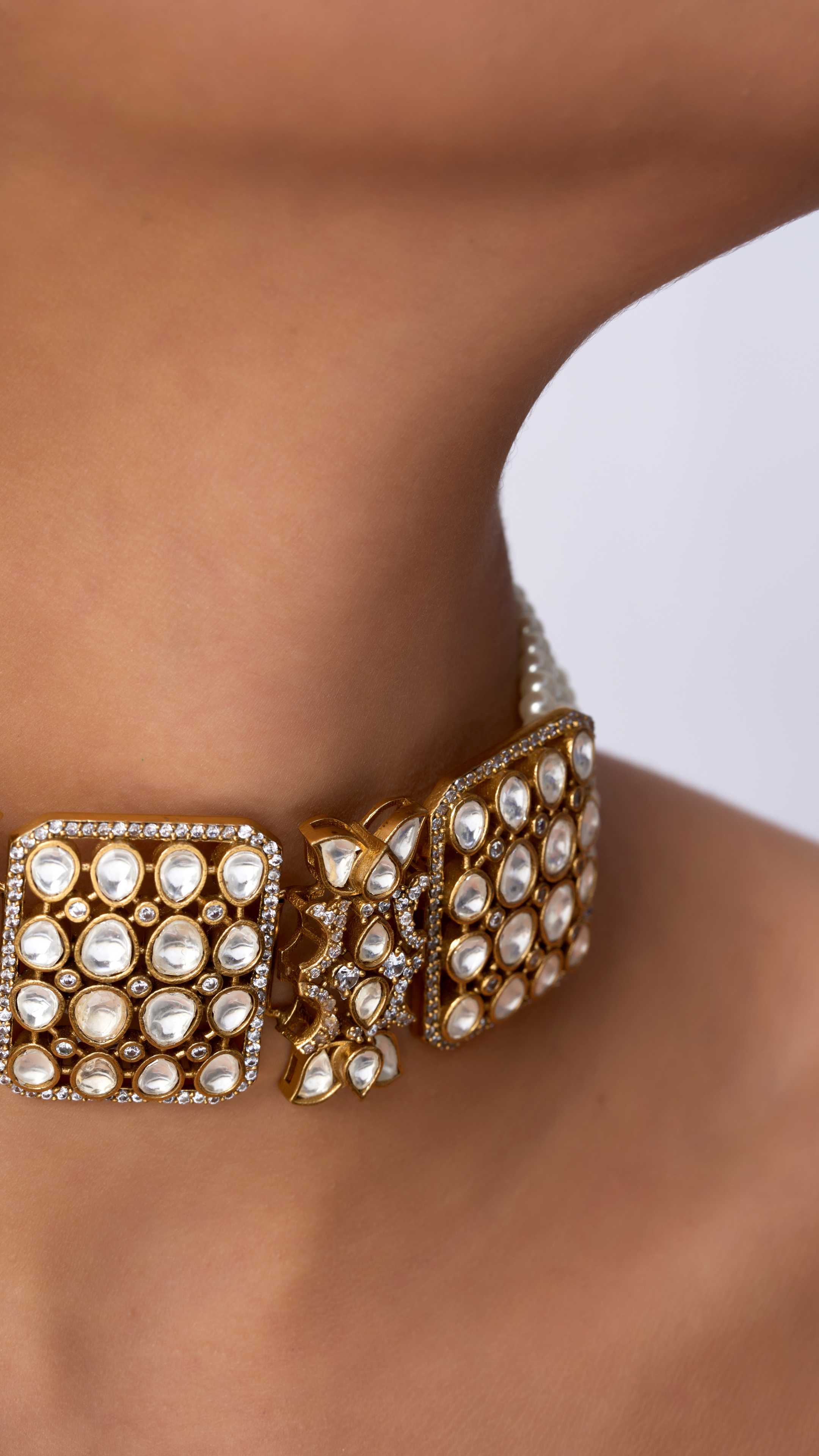 Step into sophistication with the Square Polki Choker embellished with Mossainite, a fusion of classic charm and contemporary allure. This stunning piece boasts square-cut Polki stones set against the brilliance of Mossainite, renowned for its luster and fire. Meticulously crafted, the choker radiates opulence with its intricate design and timeless elegance. Whether gracing a formal affair or adding flair to everyday wear, it captivates with its regal presence. Each detail speaks of luxury and refinement, making it a versatile statement piece for any occasion. Elevate your ensemble with the Square Polki Choker with Mossainite, a symbol of sophistication and enduring beauty.