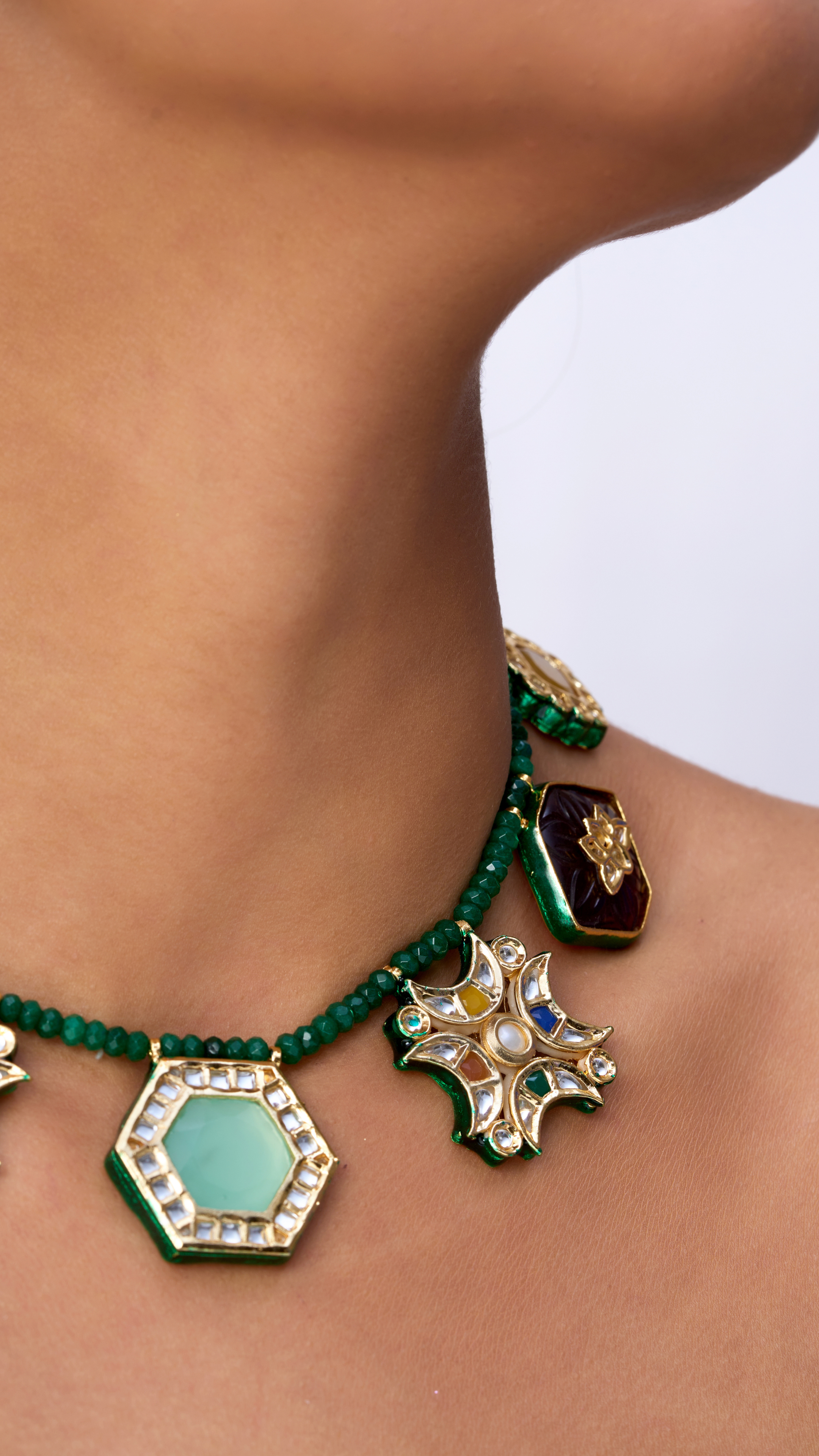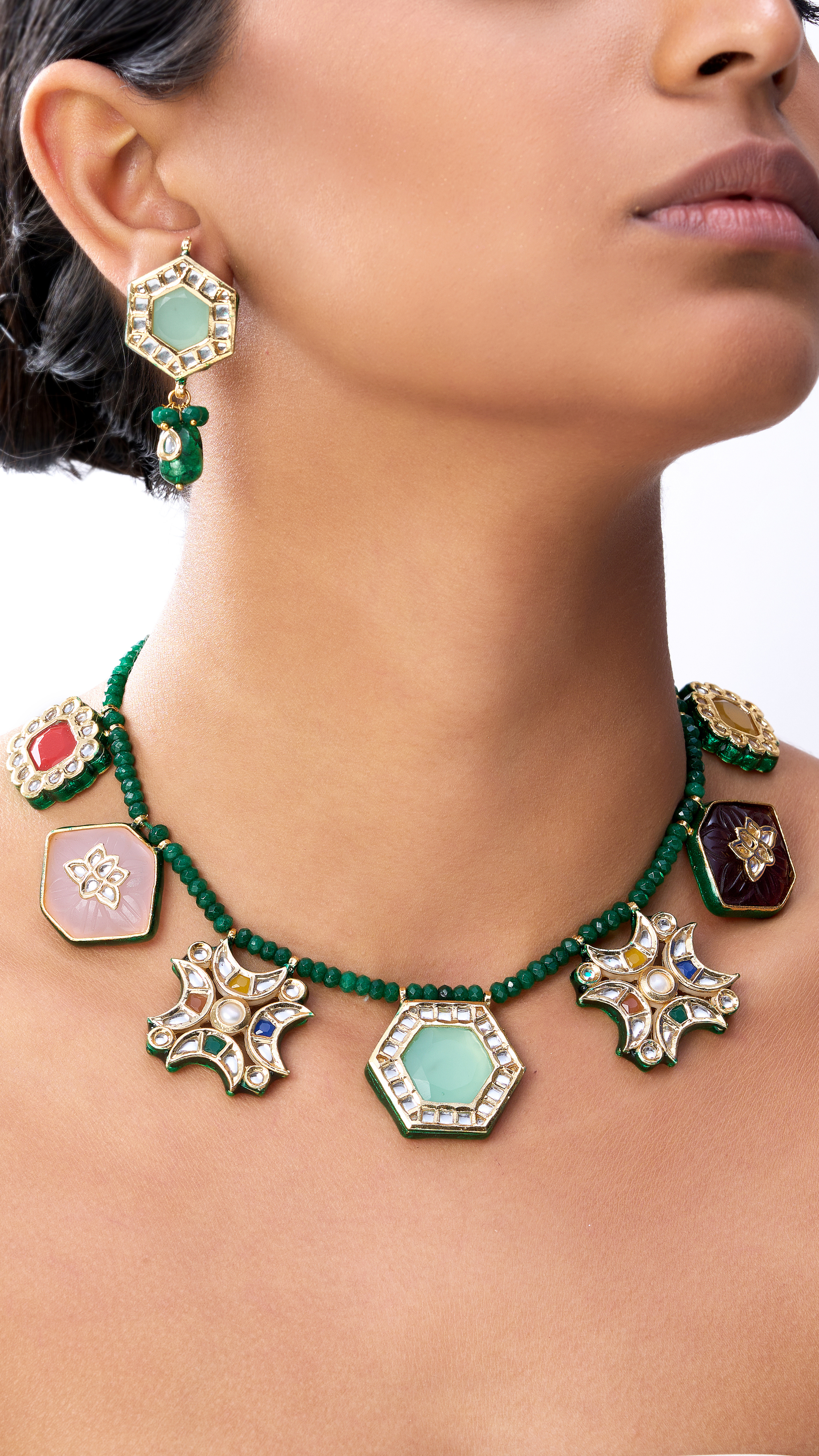 This stone necklace, embellished with pure Meena, is a testament to exquisite craftsmanship. Each stone, meticulously selected for its brilliance, is showcased without the confines of a frame. The vibrant Meena, applied with precision, adds a regal touch, creating a captivating contrast against the shimmering stones. More than just an accessory, this necklace epitomizes elegance and refinement, suitable for any occasion. Its blend of traditional artistry and modern design ensures its timeless appeal, effortlessly enhancing any ensemble with its understated charm and enduring beauty.