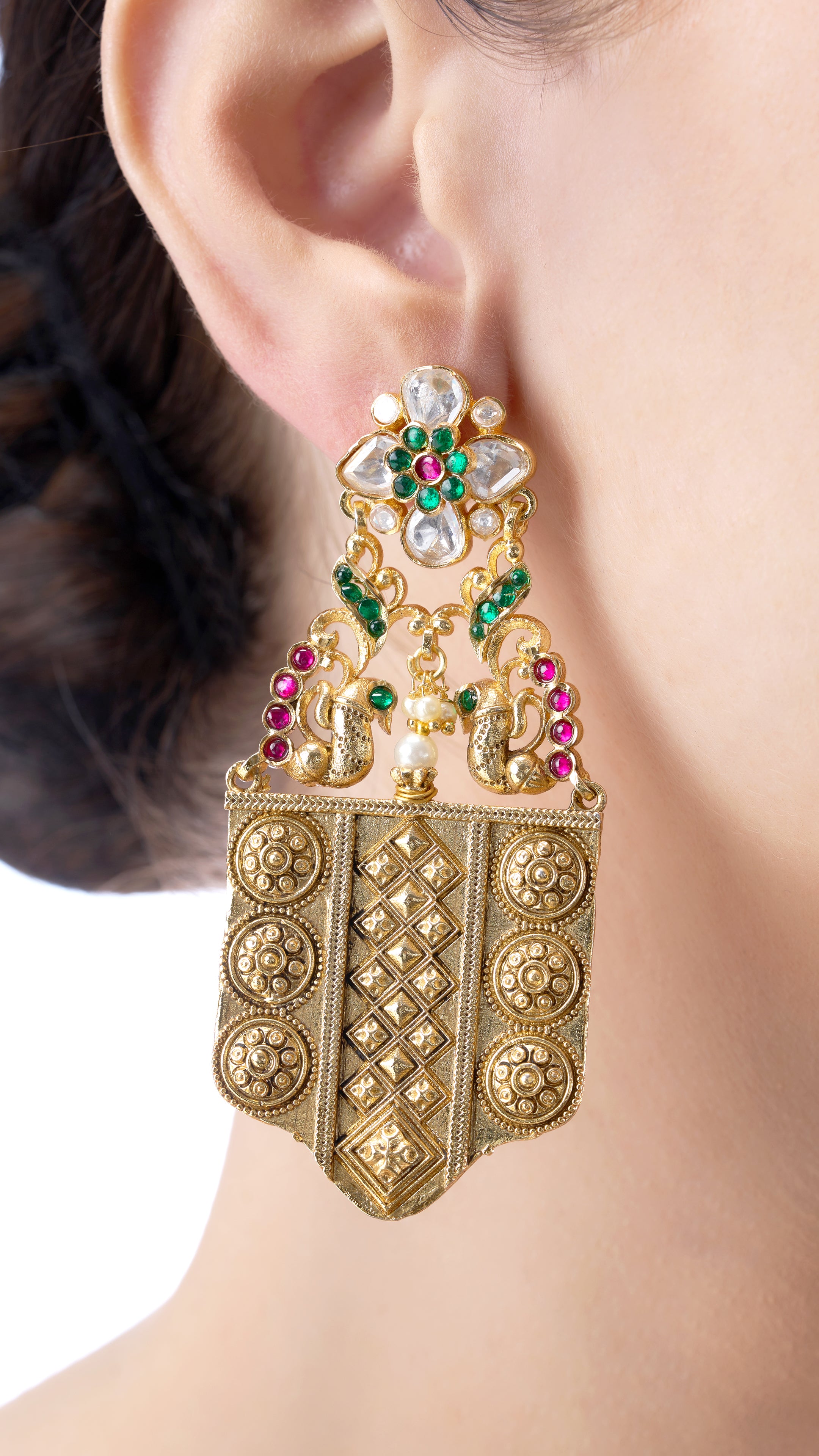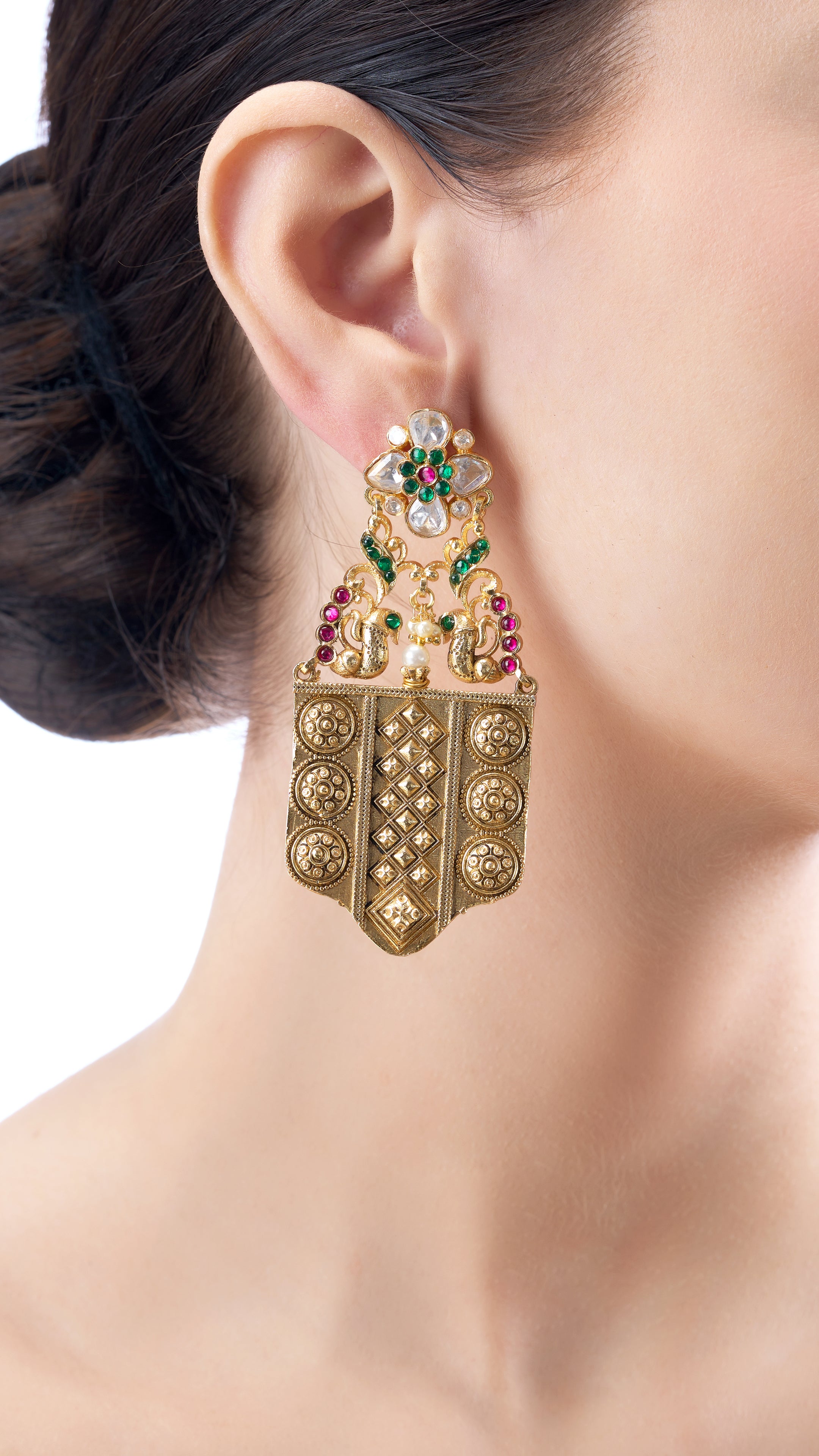 Sudarshini hand filigree peacock gold foil earrings with green and pink semi precious stone