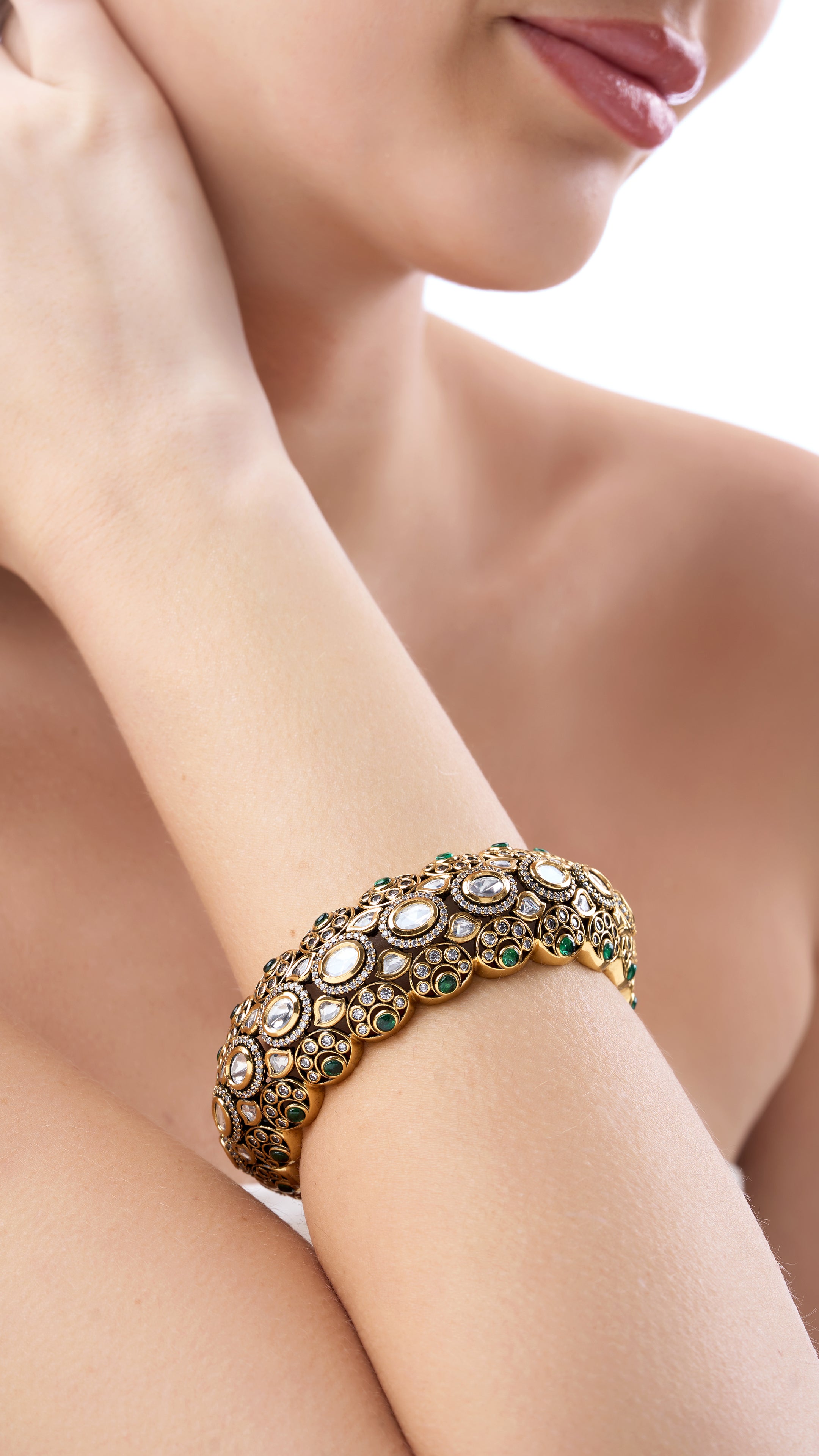 Victorian-inspired Polki bangle, set with vibrant green semi-precious stones, effortlessly fuses antique elegance with modern flair. Its intricate detailing and bold color create a captivating, royal-inspired look for any occasion.