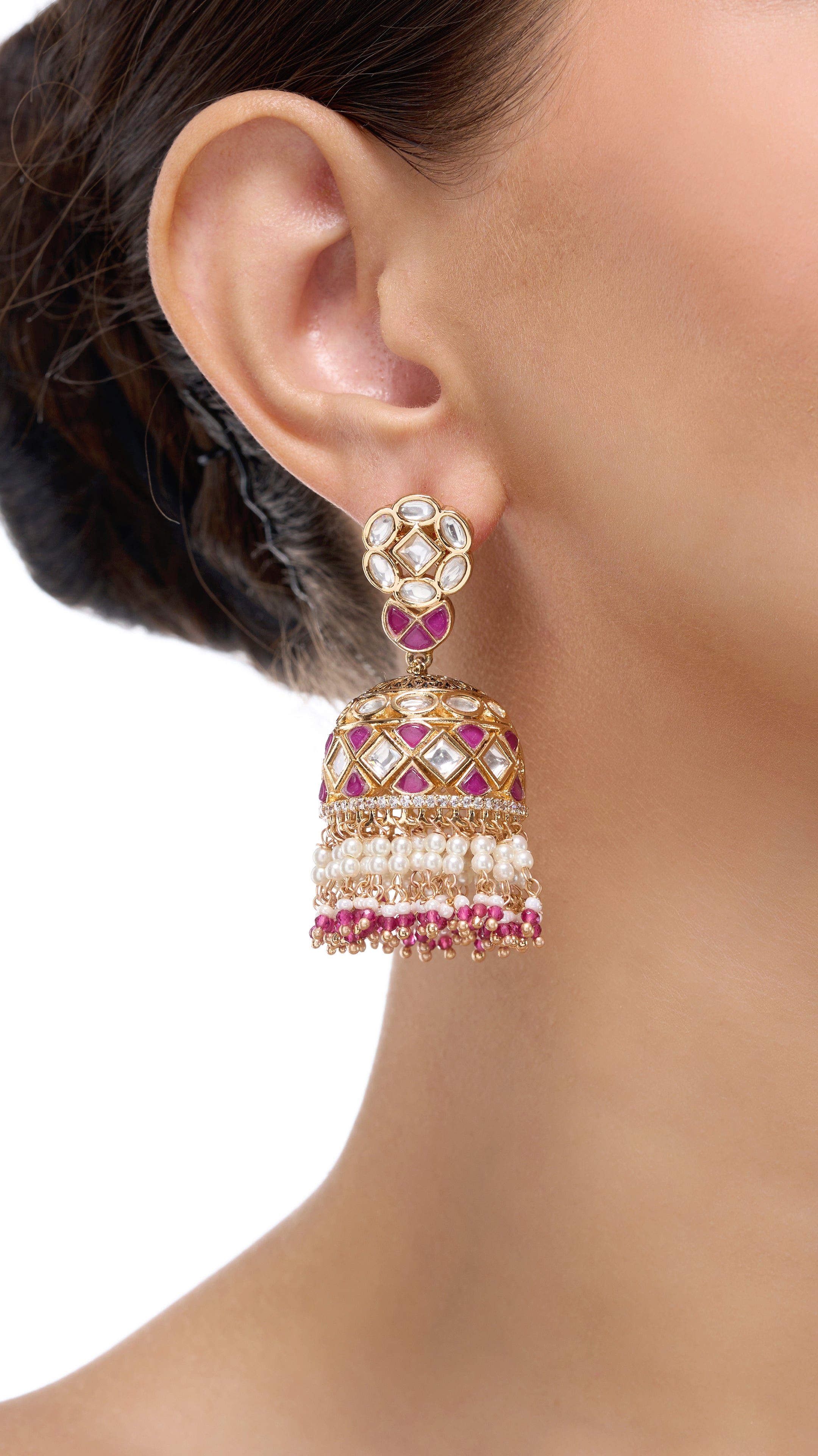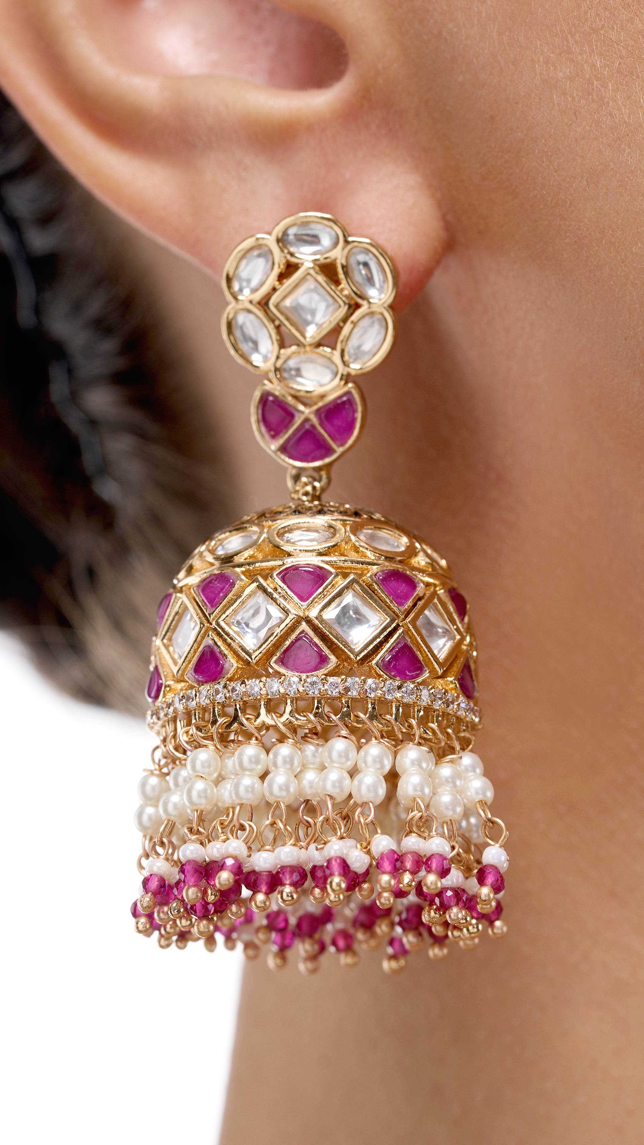 Gold Foil Kundan Umbrella Jhumki with Pearls in Ruby—where opulence meets tradition. These stunning jhumkis feature an elegant umbrella-shaped design adorned with radiant Kundan stones and luxurious gold foil accents. The deep ruby red hue, complemented by delicate pearls, adds a touch of regal charm and sophistication. Perfect for special occasions or to elevate any outfit, these jhumkis offer a timeless blend of classic beauty and contemporary flair.