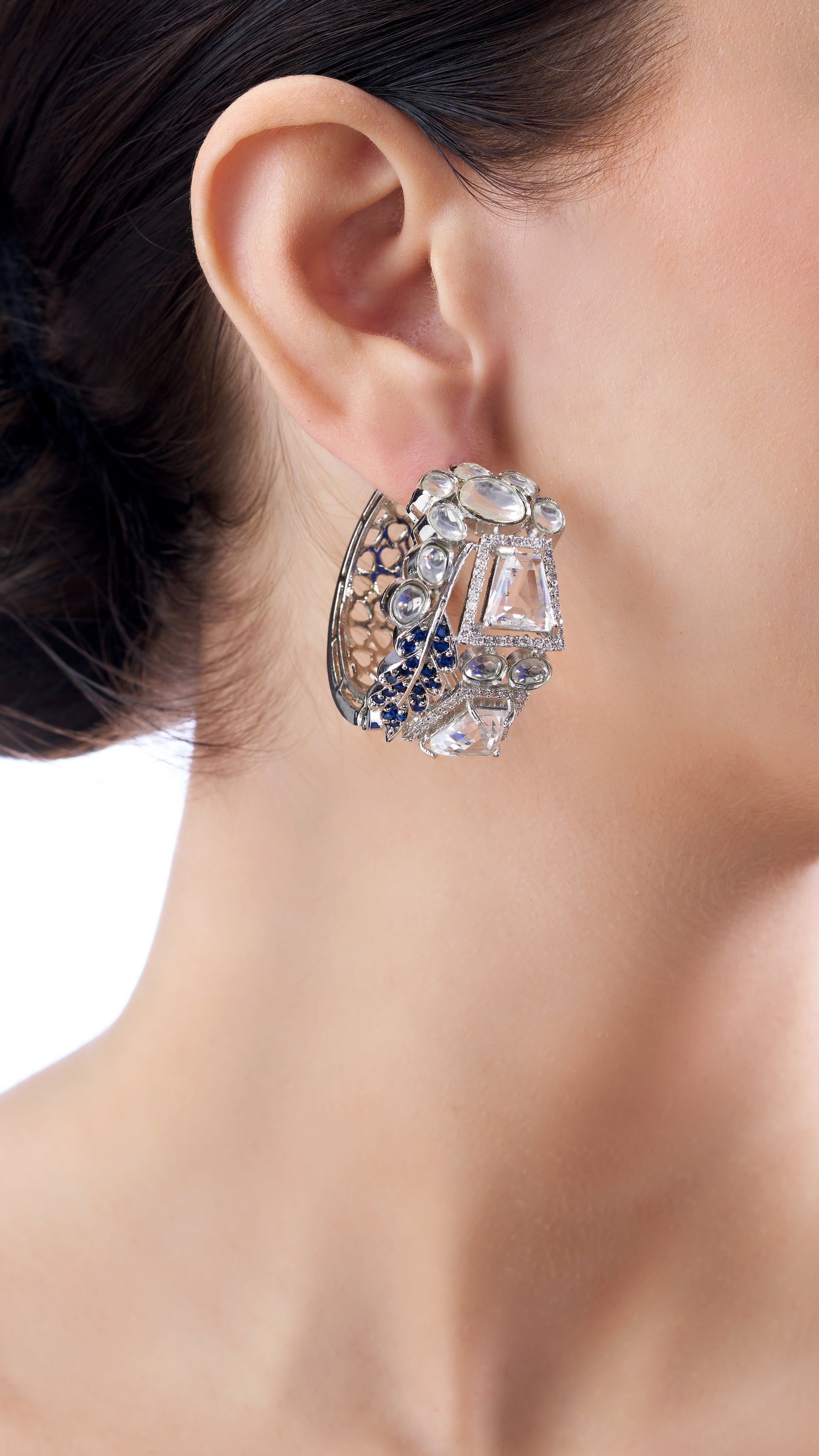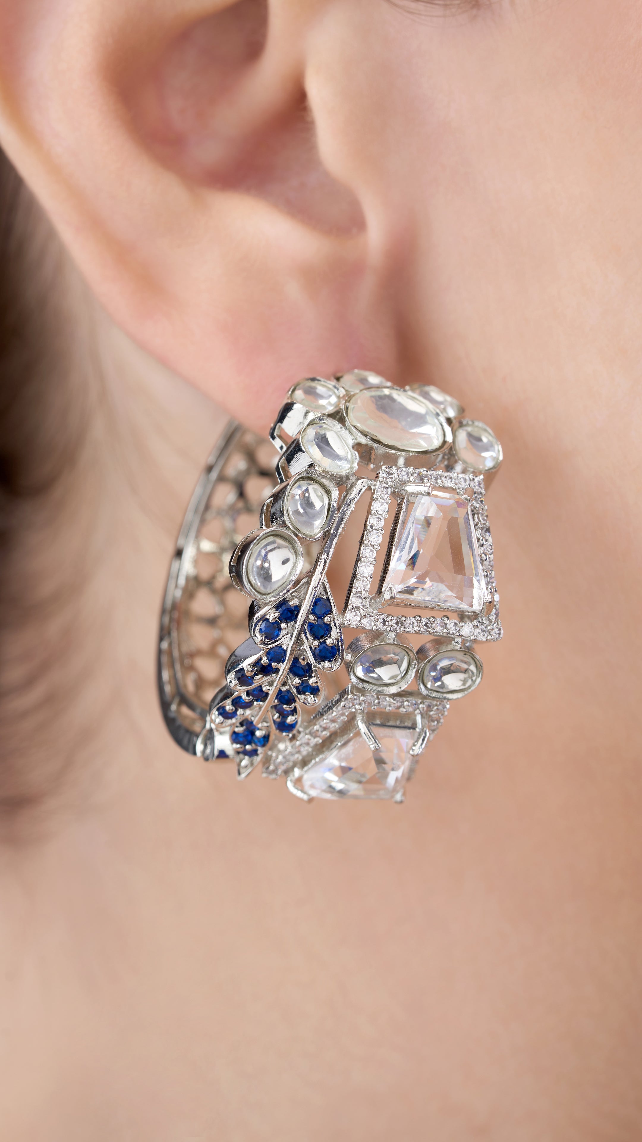 Abstract mesh gold Kundan hoops, adorned with blue semi-precious stones, blend intricate craftsmanship with modern design. A striking statement piece that adds elegance and vibrant color to any outfit.