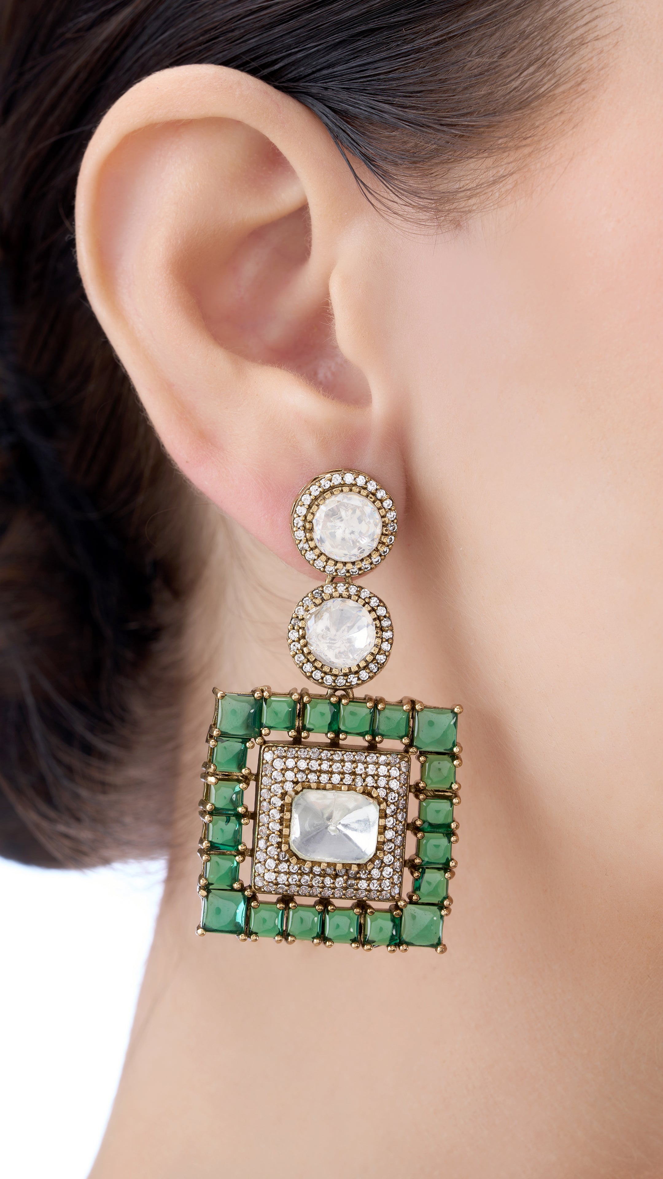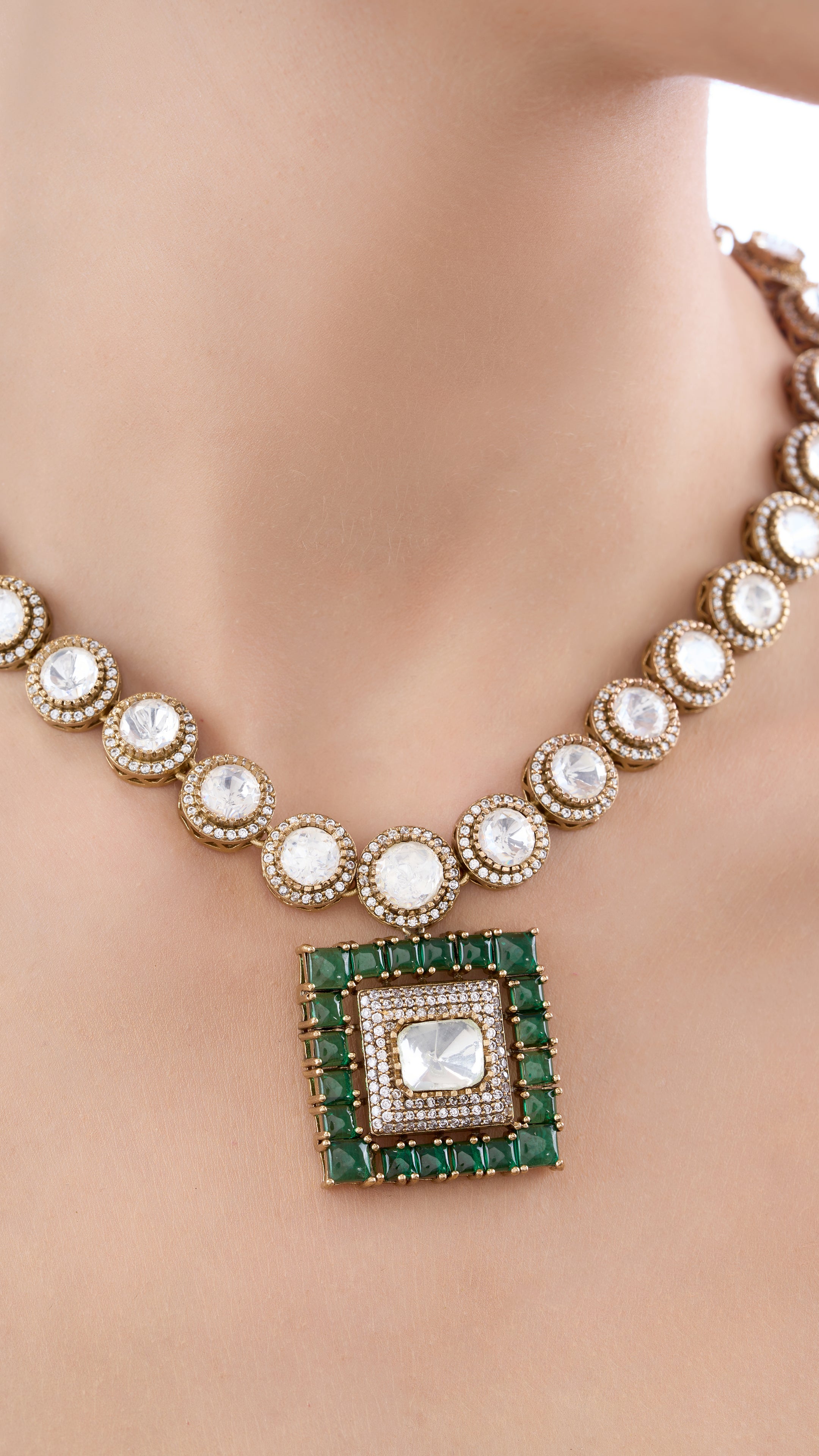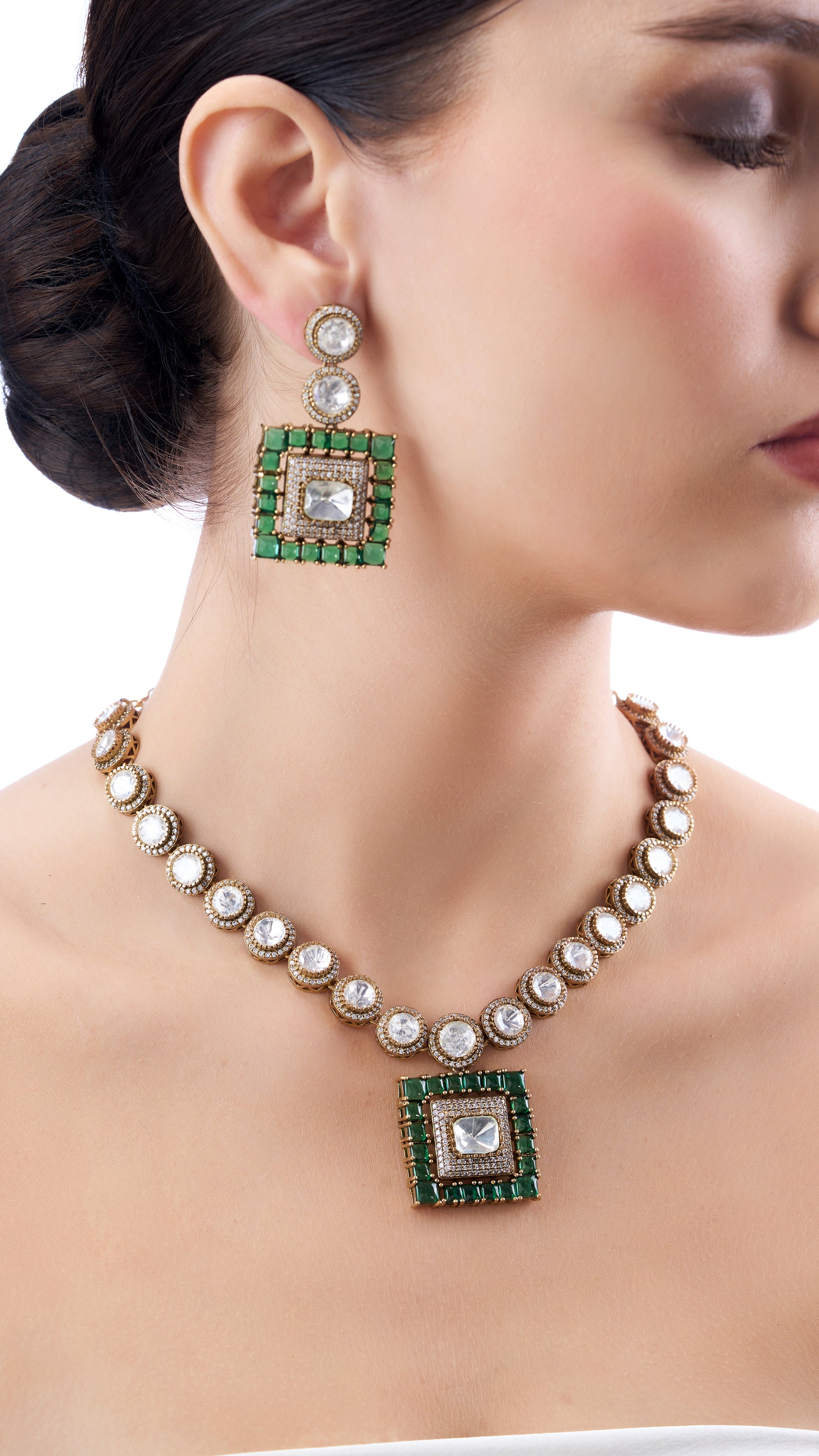 Square Polki necklace is adorned with vibrant semi-precious green stones, offering a bold yet elegant design that effortlessly blends classic beauty with contemporary style. Perfect for any special occasion.