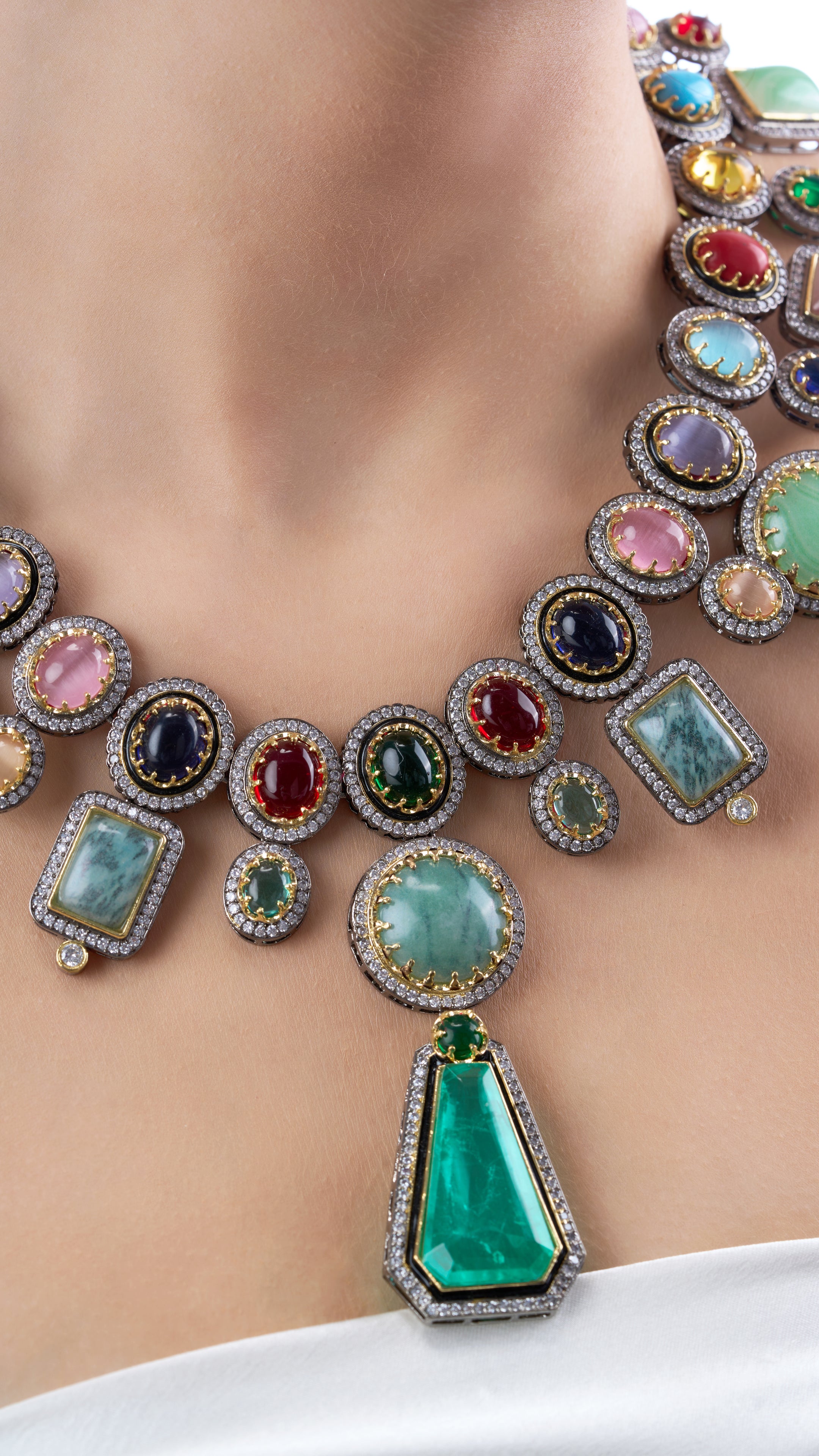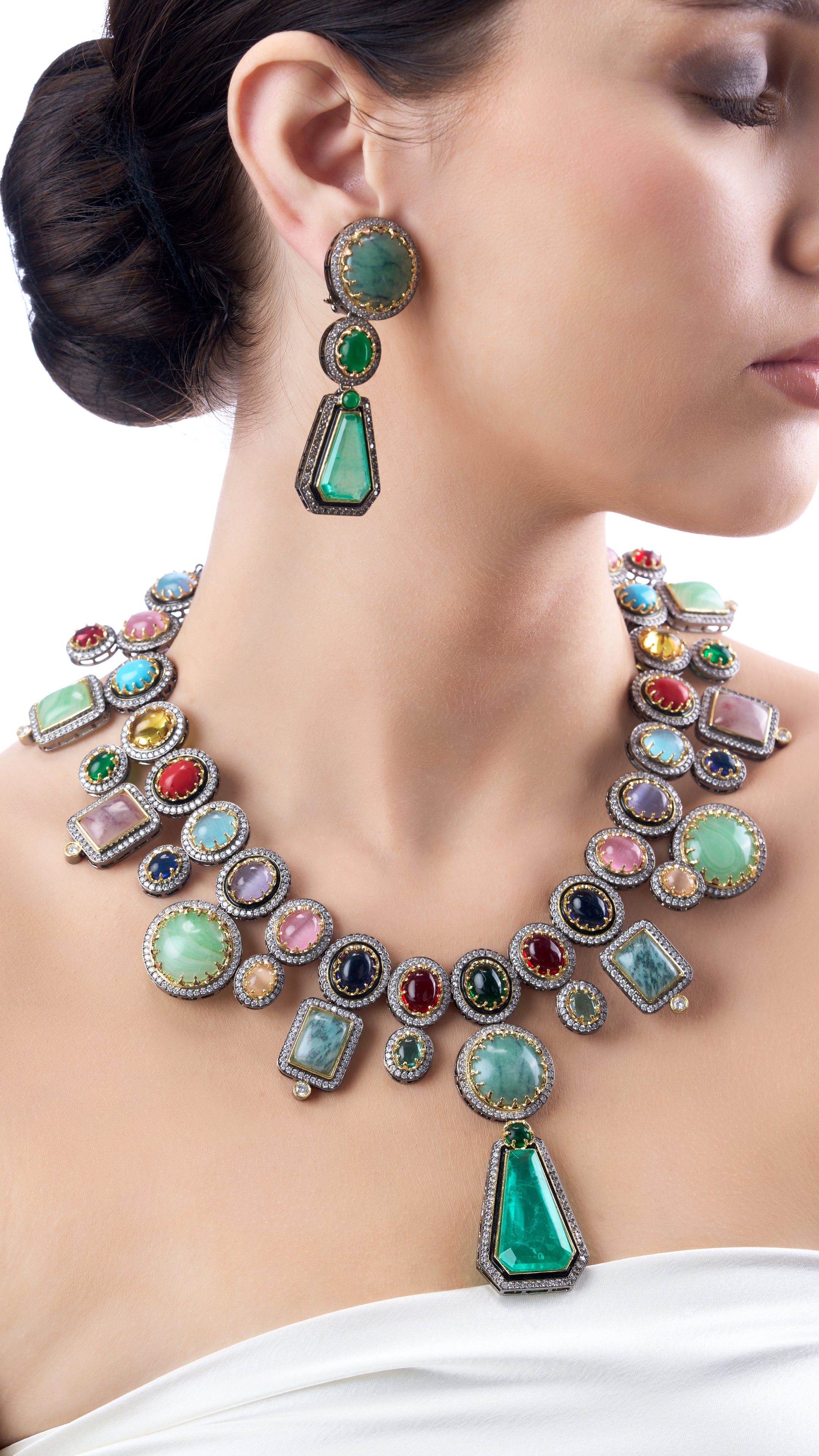 Vibrant array of multi-color semi-precious stones comes together in this necklace set, offering a burst of radiant charm.