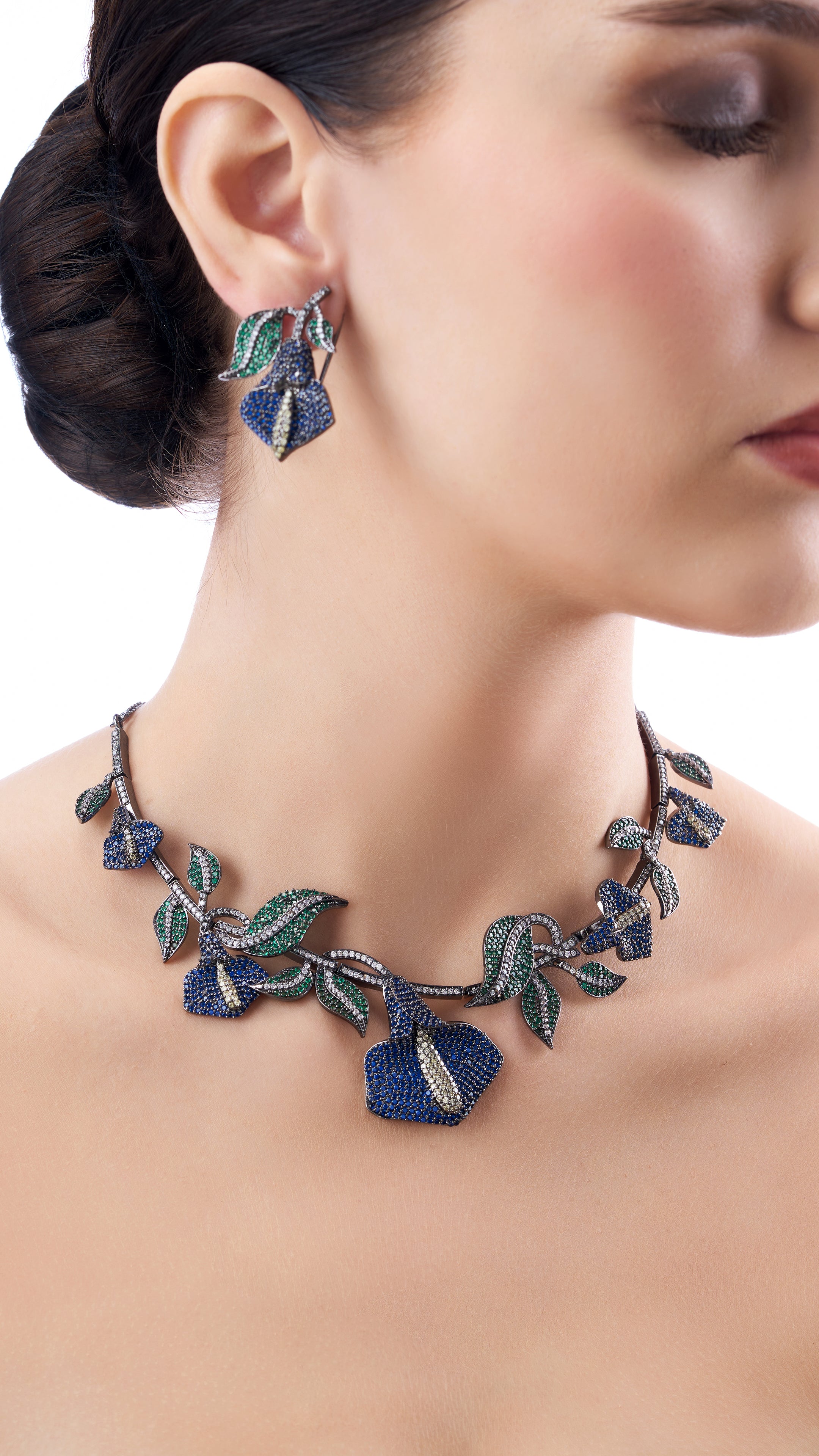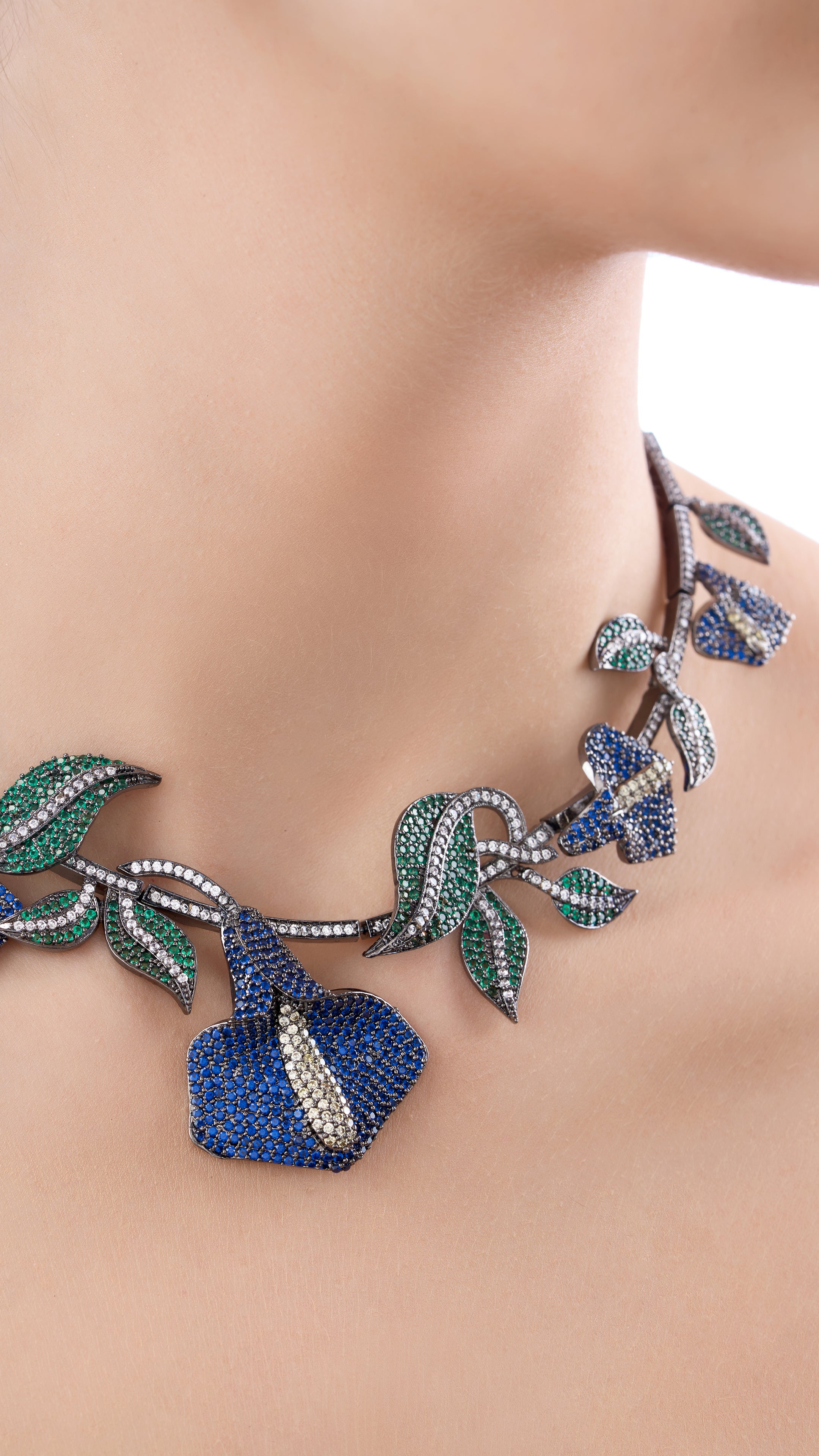 Varnika abstract crystal victoran flower leaf necklace set in blue and green