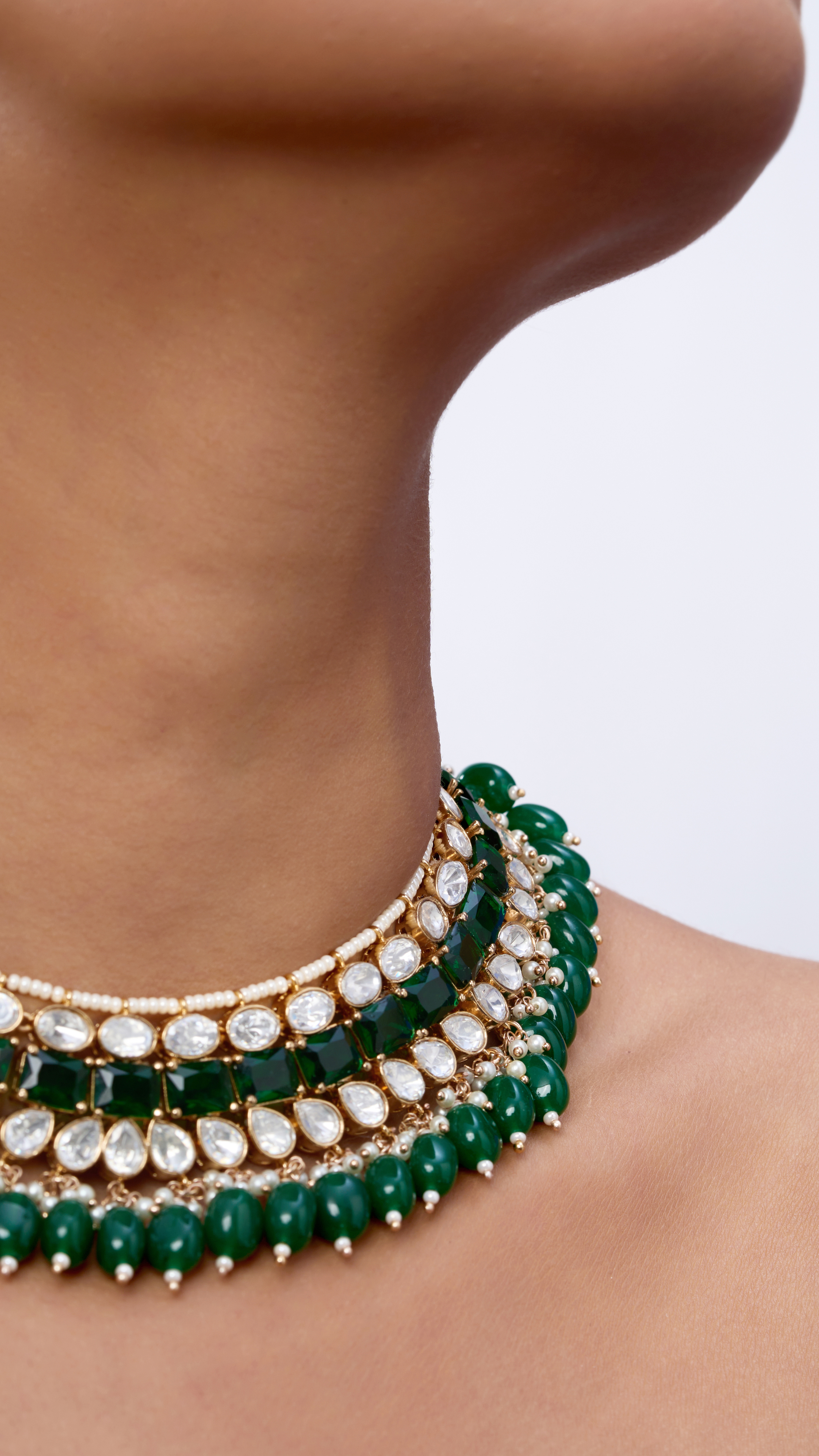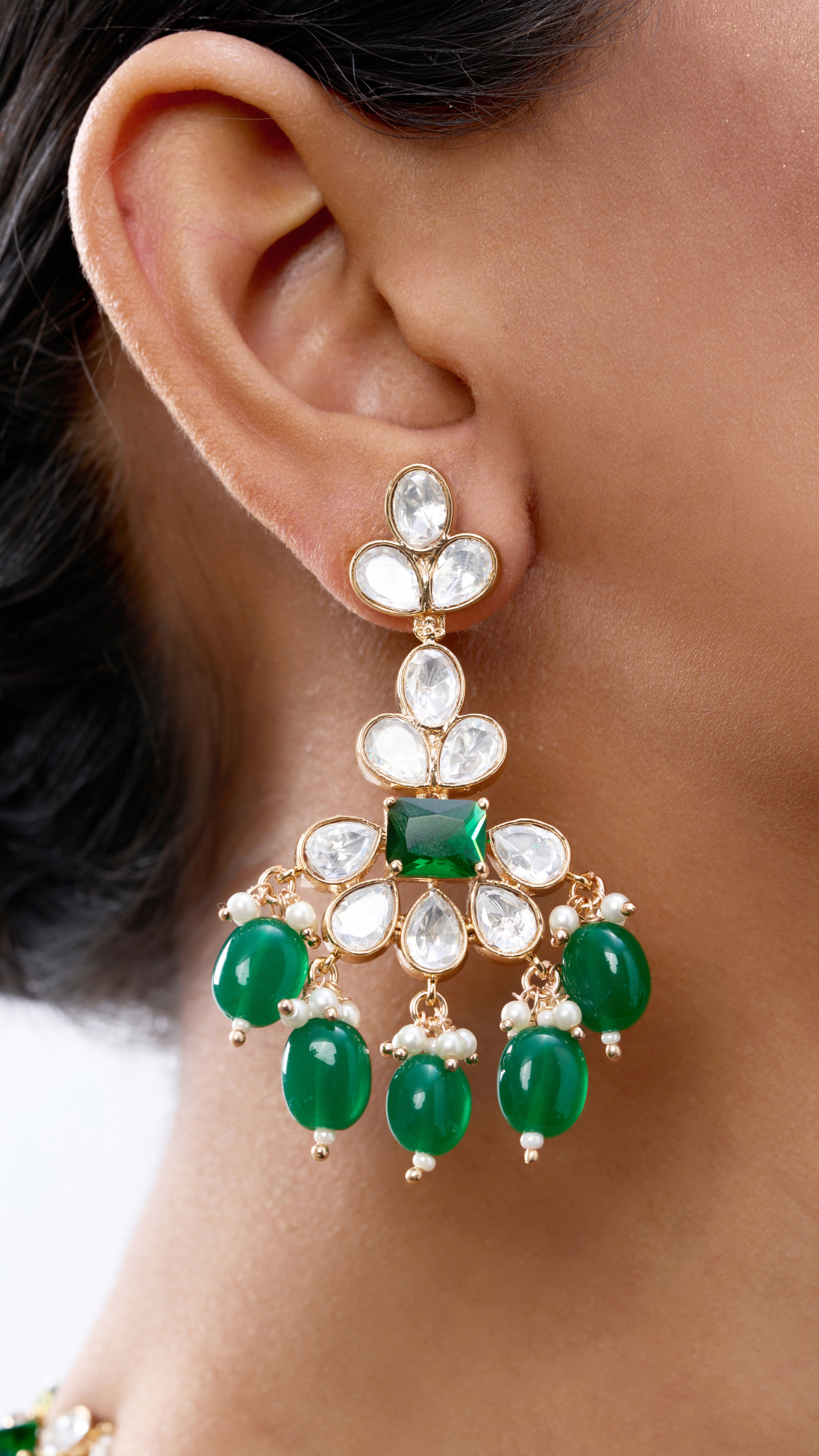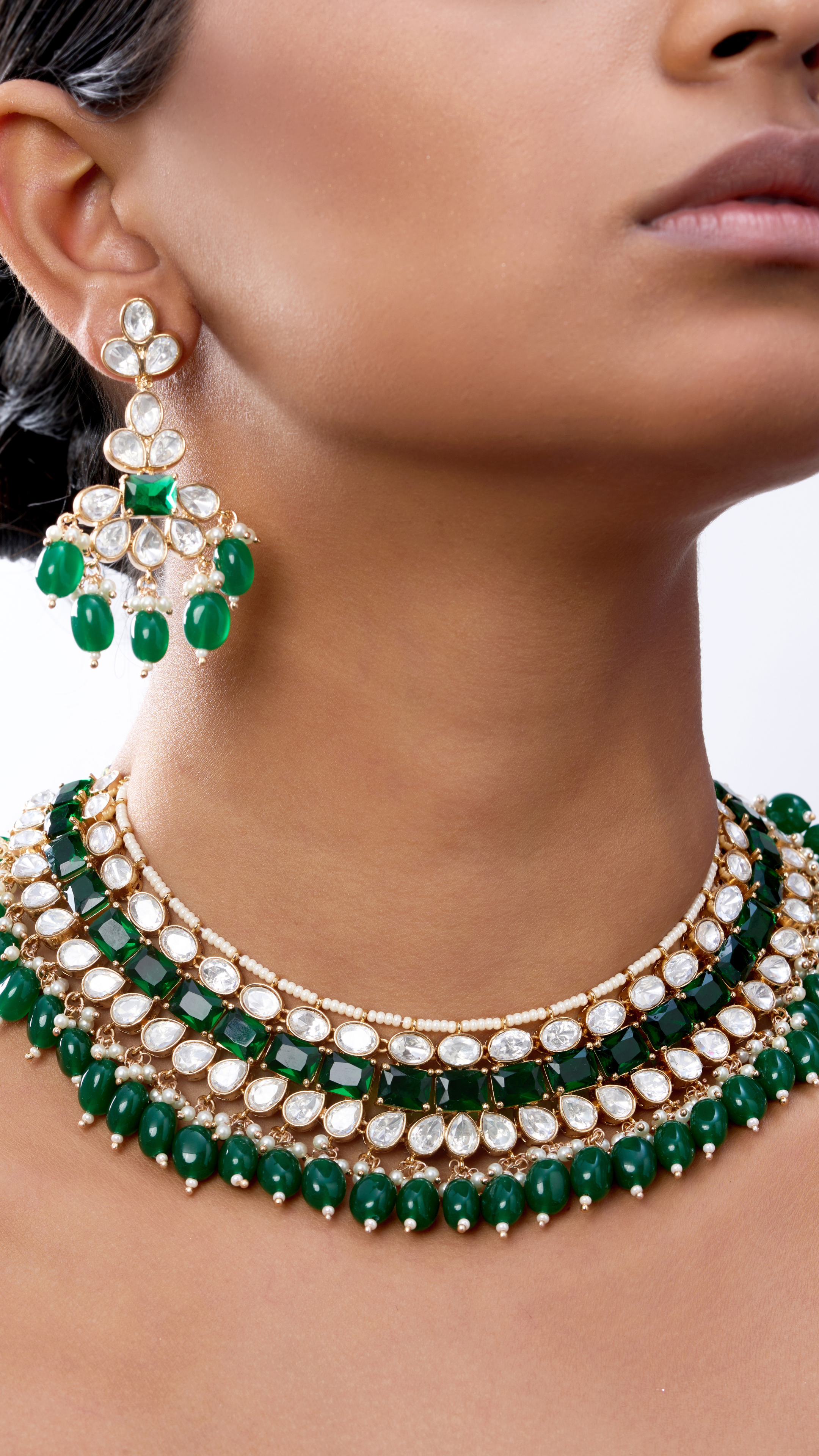 Polki's timeless elegance intertwines with the captivating charm of emeralds, creating an enchanting symphony of natural beauty and opulence. Each delicate polki setting enhances the emerald's vivid hue, radiating an aura of effortless sophistication and dazzling allure, celebrating the union of tradition and luxury in every gleaming facet.