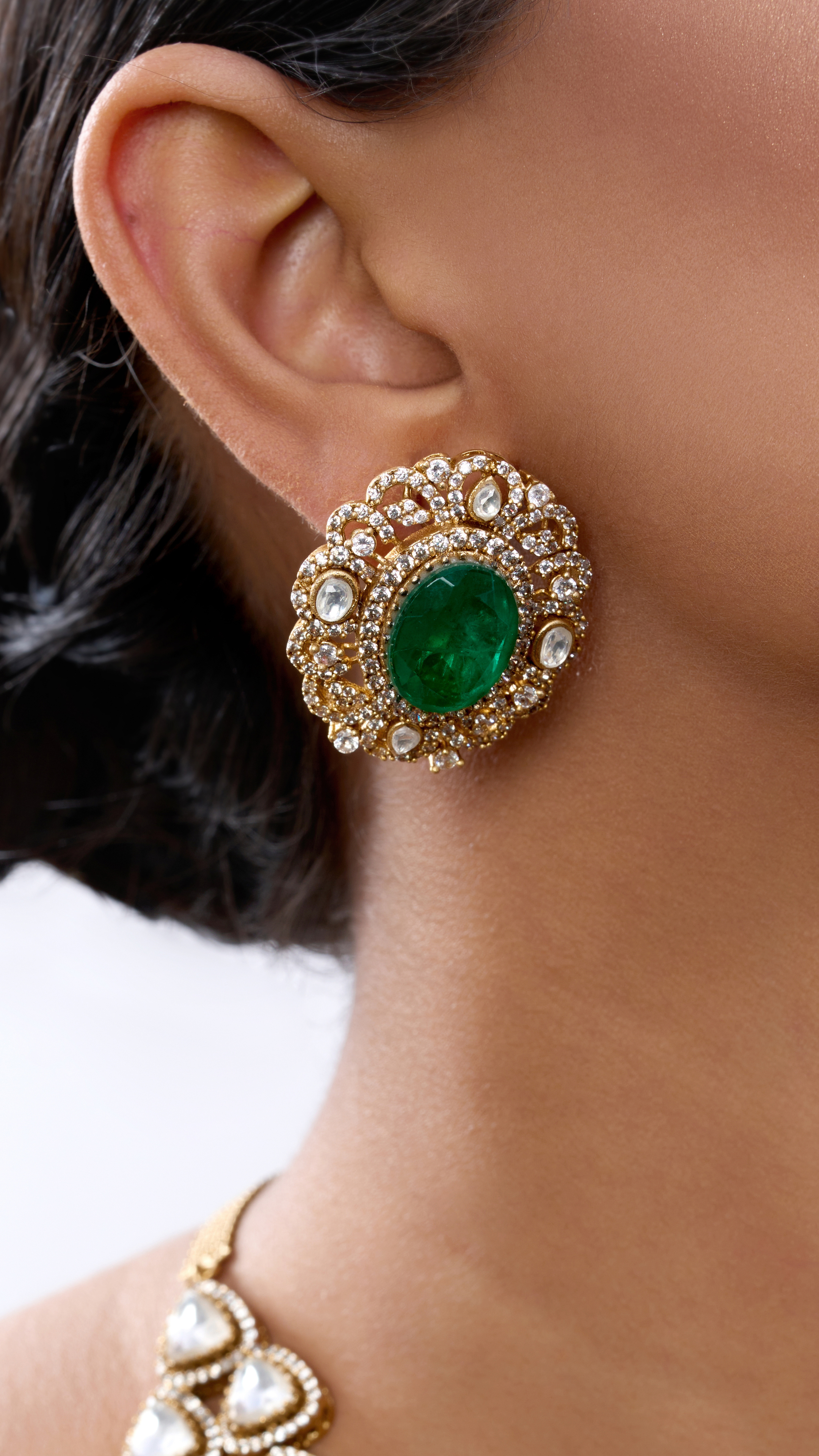 Polki's timeless elegance intertwines with the captivating allure of emeralds, creating an enchanting symphony of natural beauty and opulence. Each delicate polki setting enhances the emerald's vivid hue, radiating an aura of effortless sophistication and dazzling allure, celebrating the union of tradition and luxury in every gleaming facet.