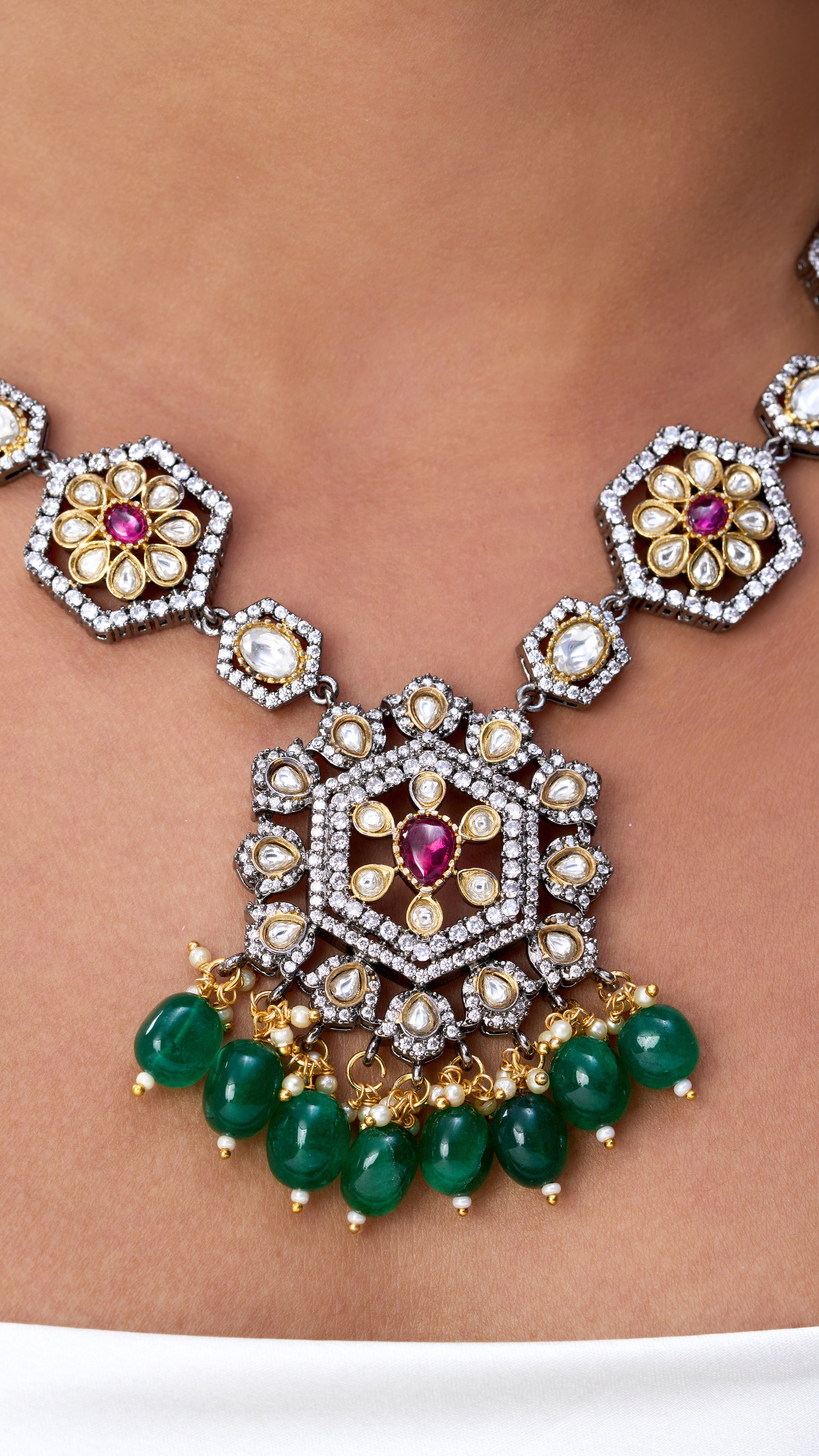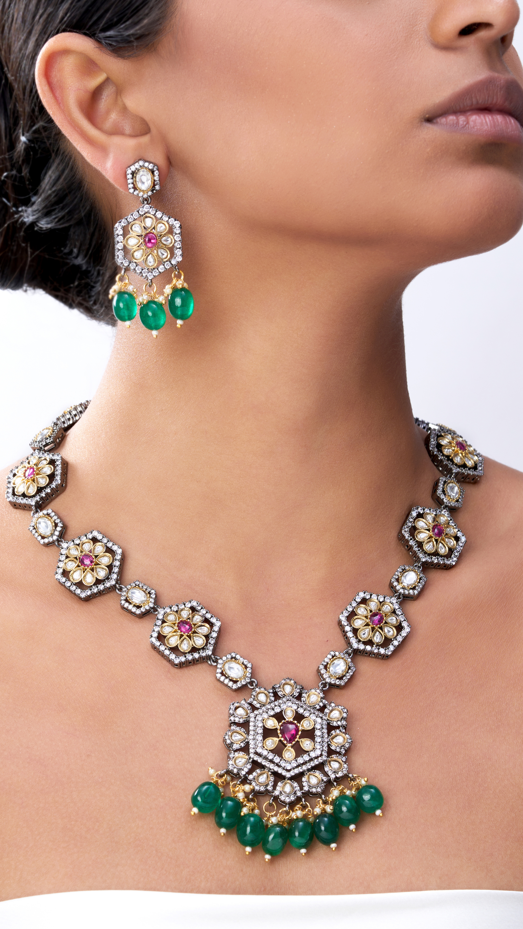 Transporting you to the grandeur of the Victorian era, our Emerald Polki Set exudes regal charm and opulent beauty. Inspired by the exquisite craftsmanship of the period, each piece captures the essence of elegance and sophistication, adorned with shimmering emeralds that evoke the splendor of bygone royalty.