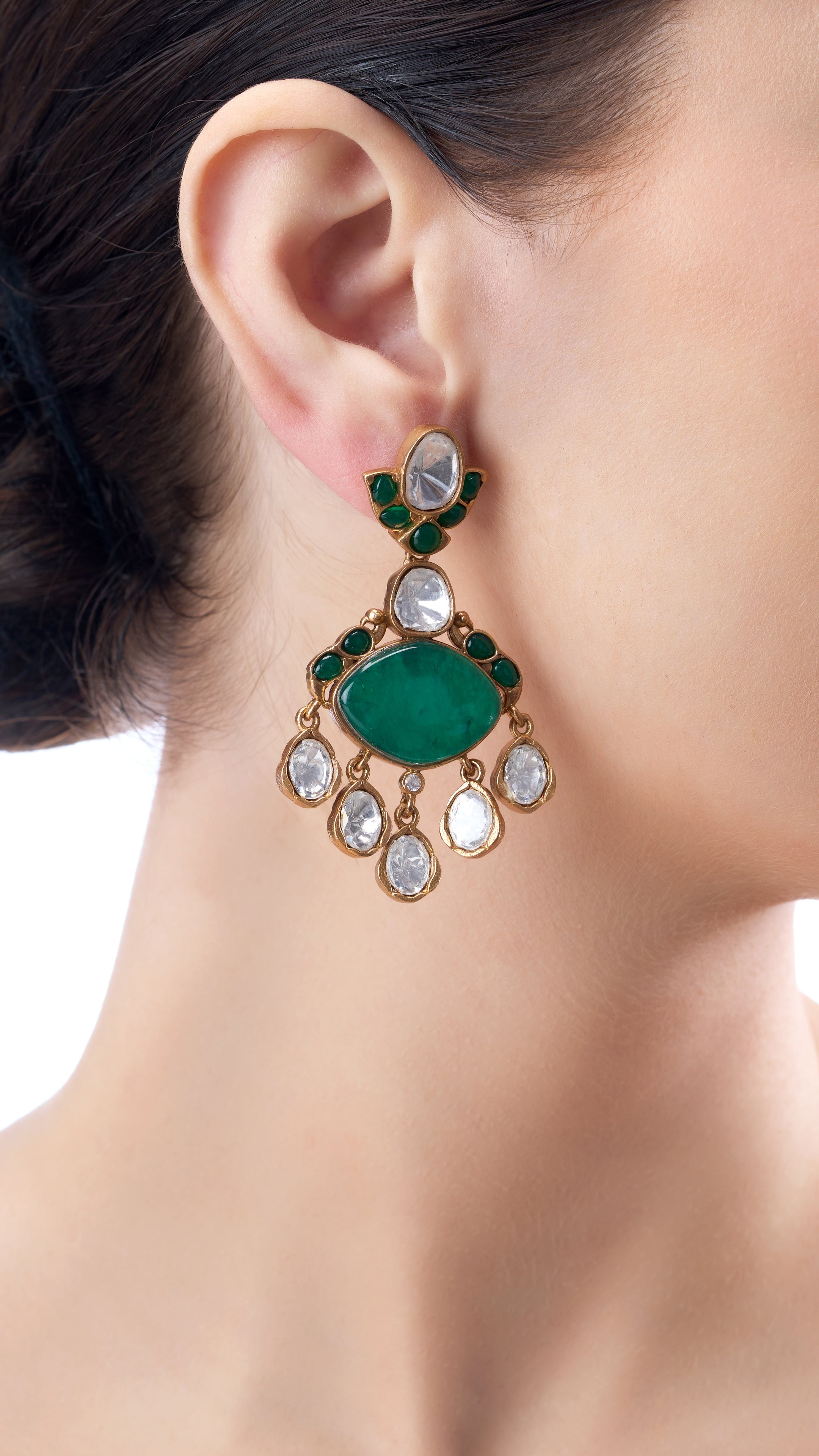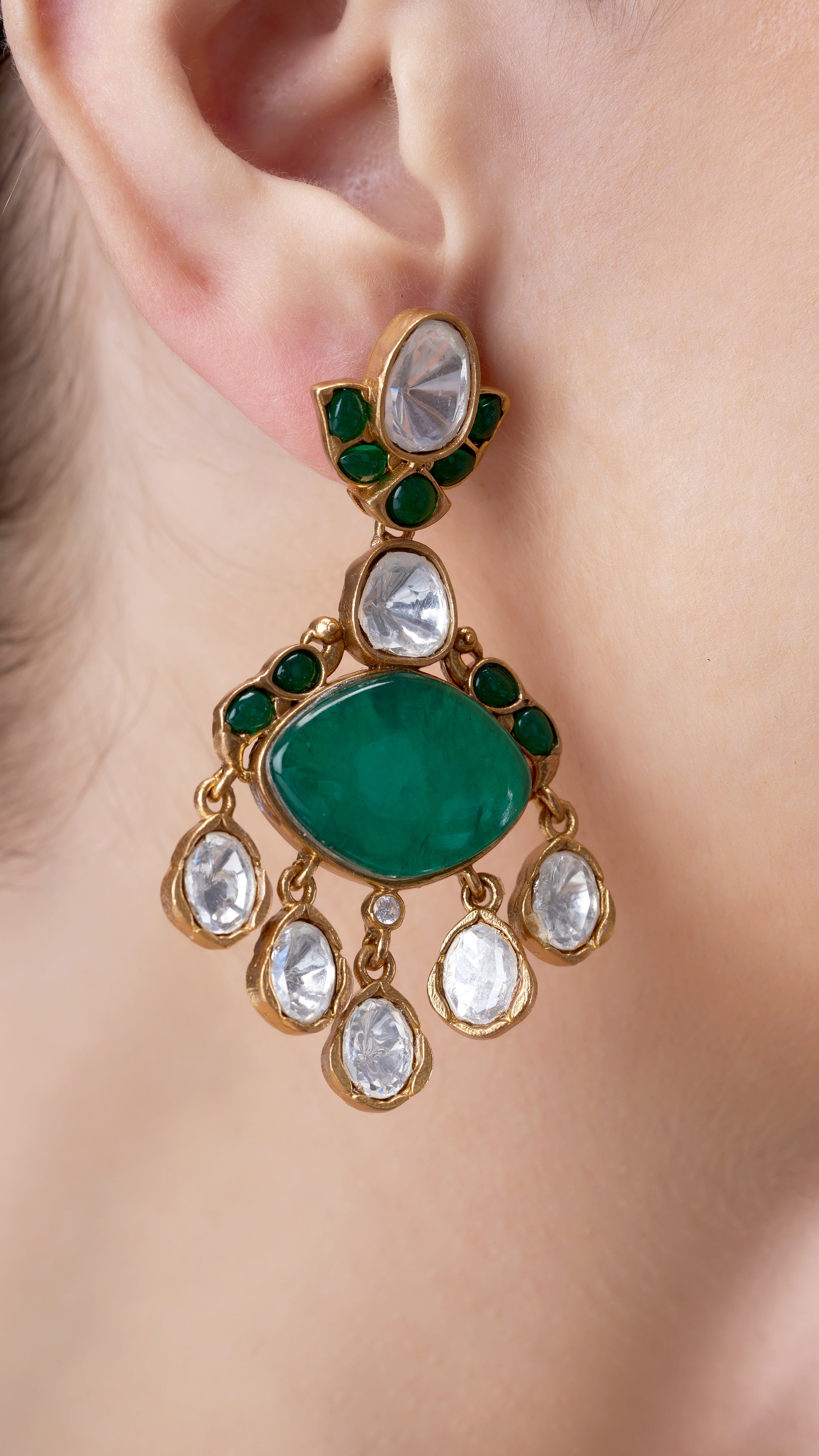 Semi-precious Polki stone earrings in green combine intricate craftsmanship with a vibrant, captivating sparkle that draws the eye.