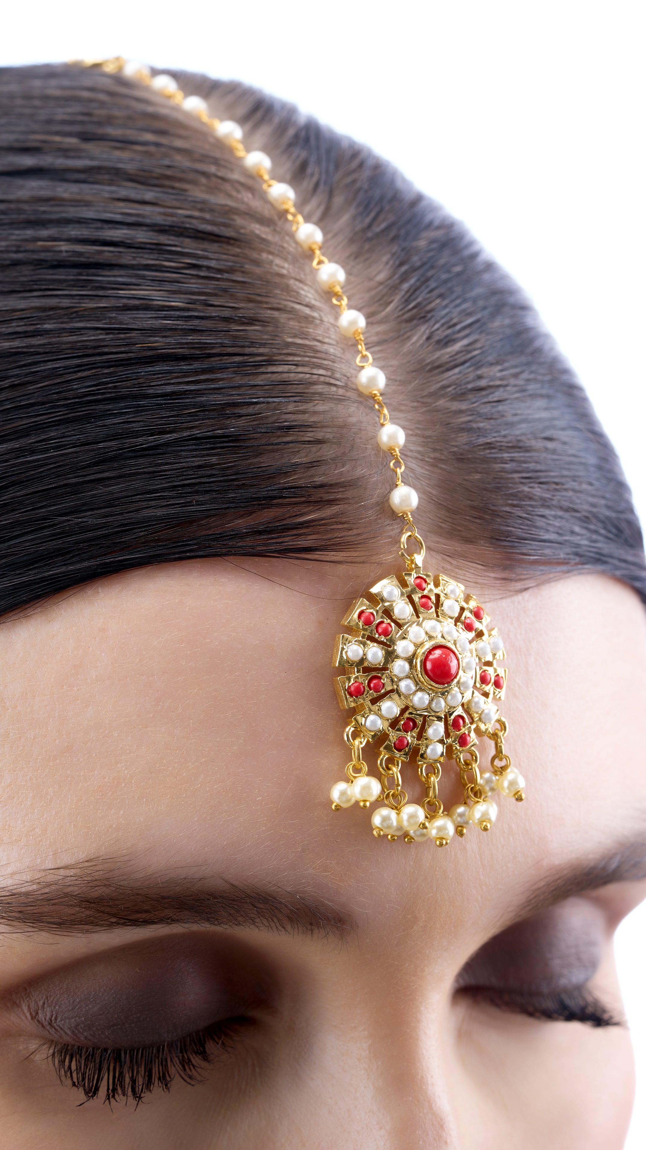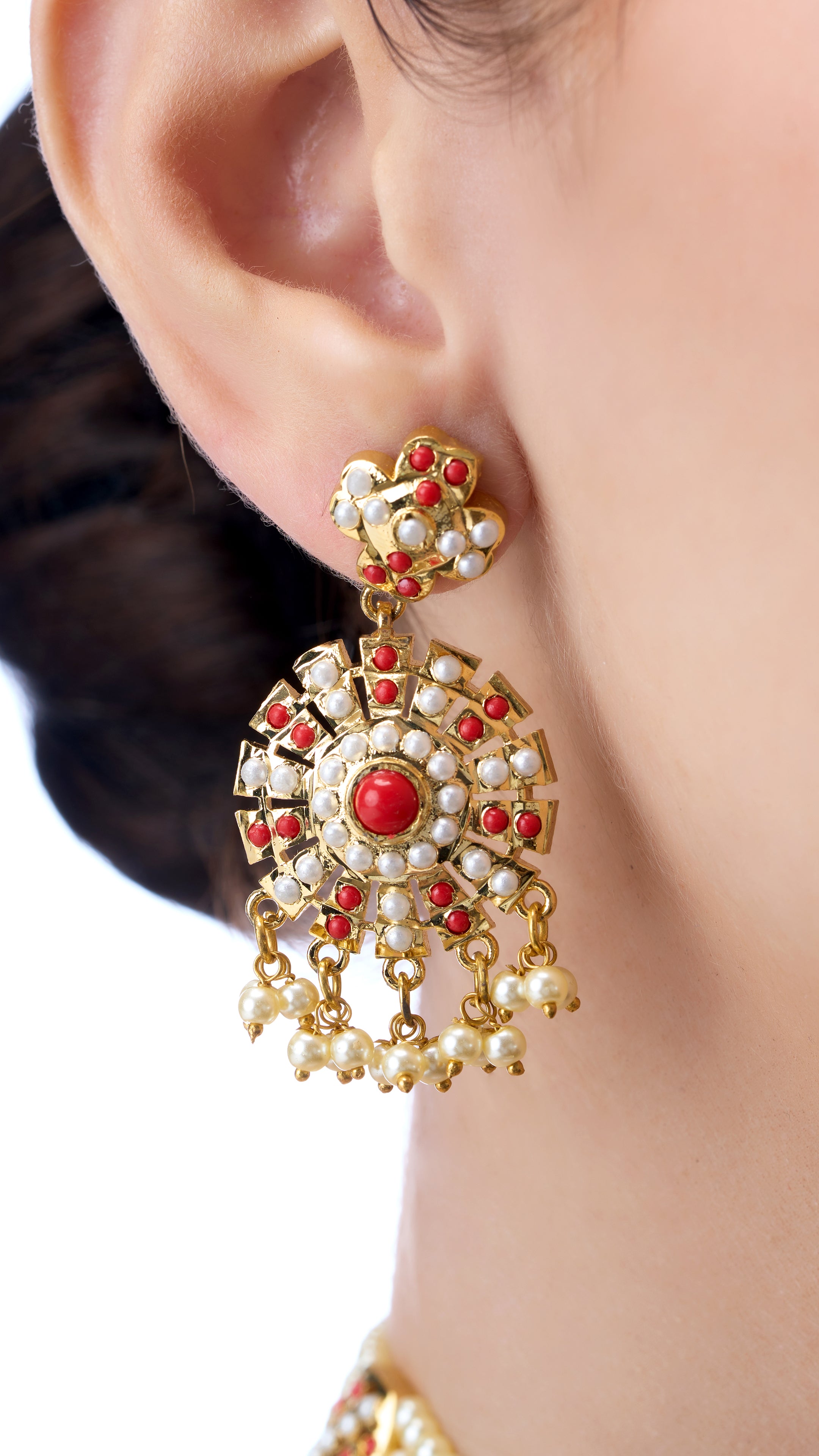 Vijayanti jadau gold foil choker necklace set with pure pearls in red