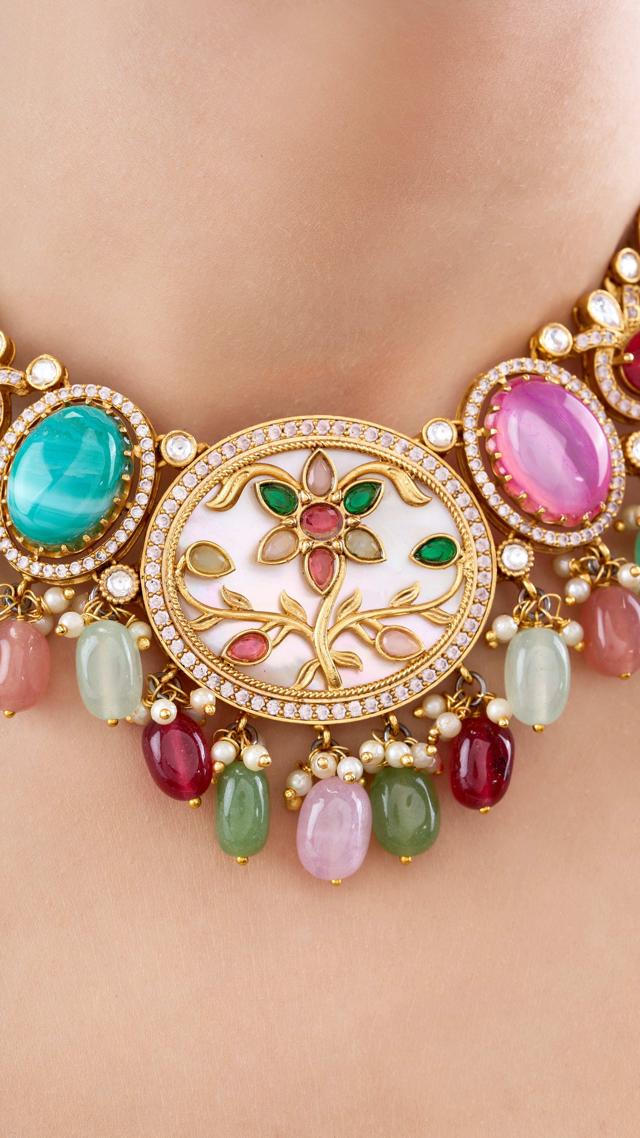 Vishala haldini mother of pearl choker with semi precious stones in multi colour