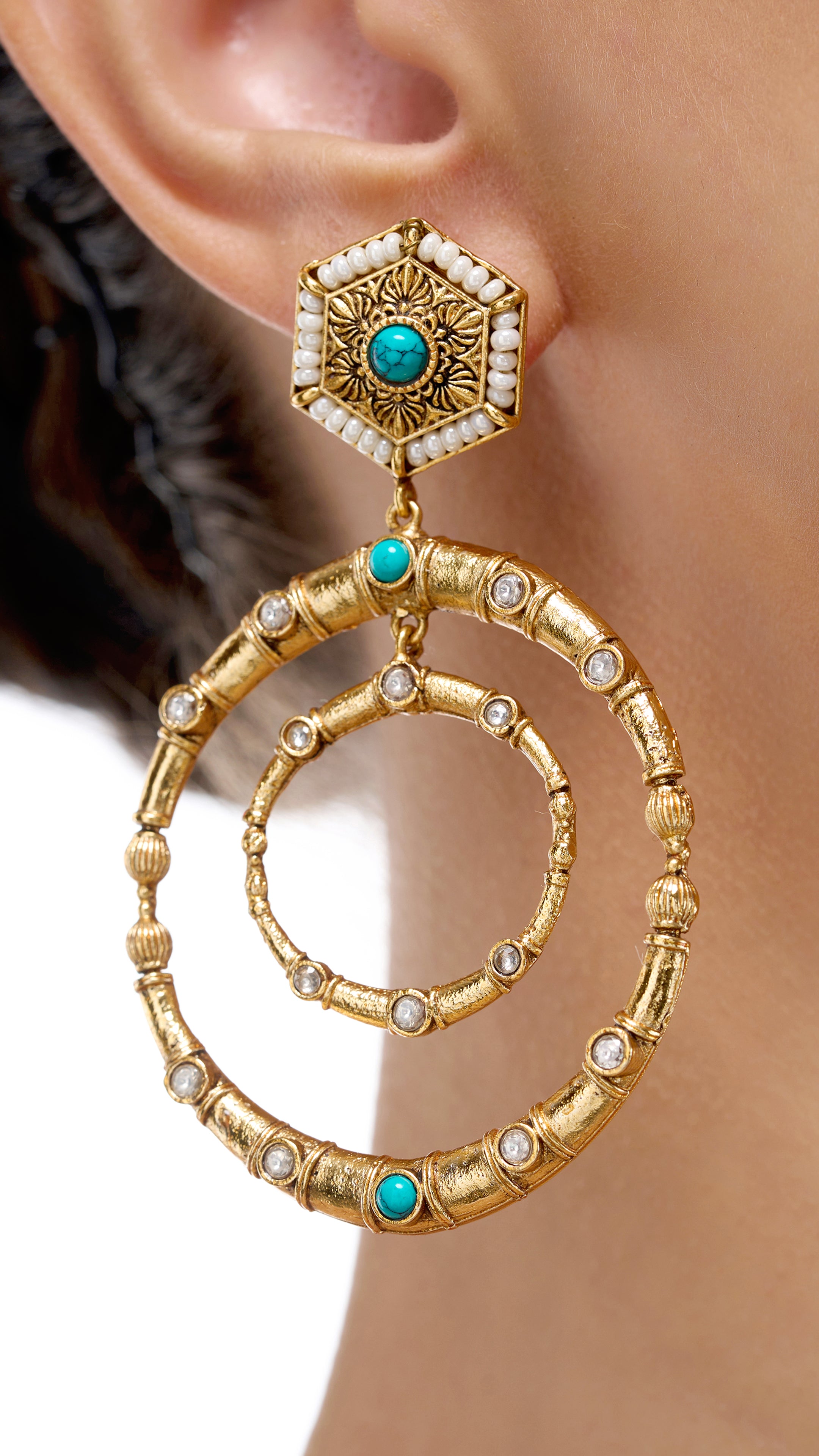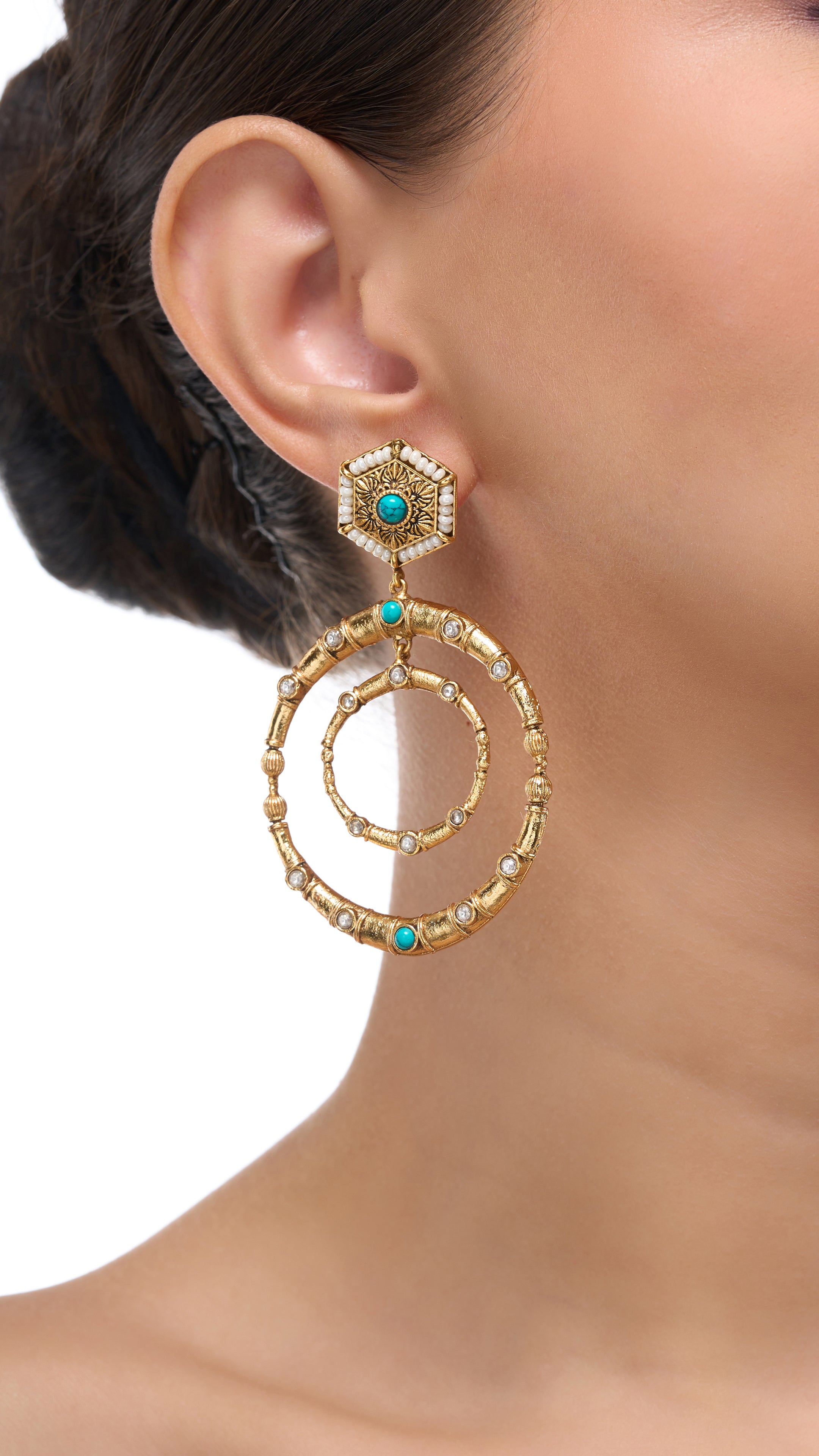 Embrace elegance with our Double Filigree Hoops in Firoza. The intricate two-tiered filigree pattern, highlighted in a stunning turquoise tone, provides a bold yet refined statement, making them ideal for both casual and formal occasions.