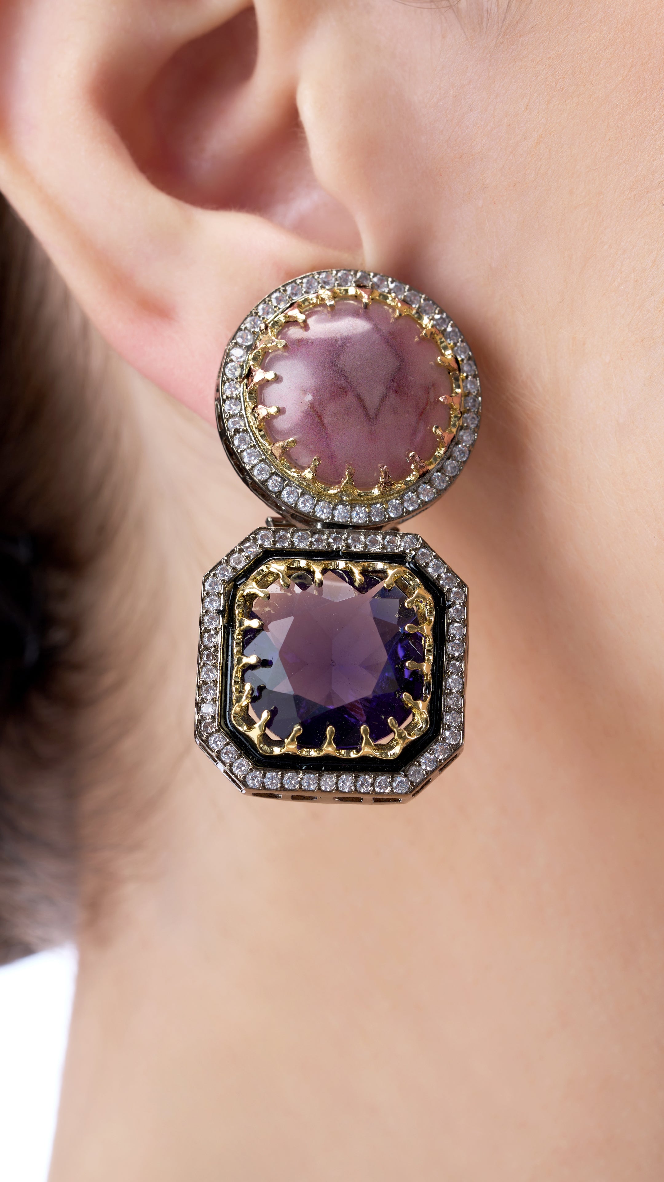 Earring set, featuring double stones in vibrant purple semi-precious gems, combines modern design with a striking splash of color.