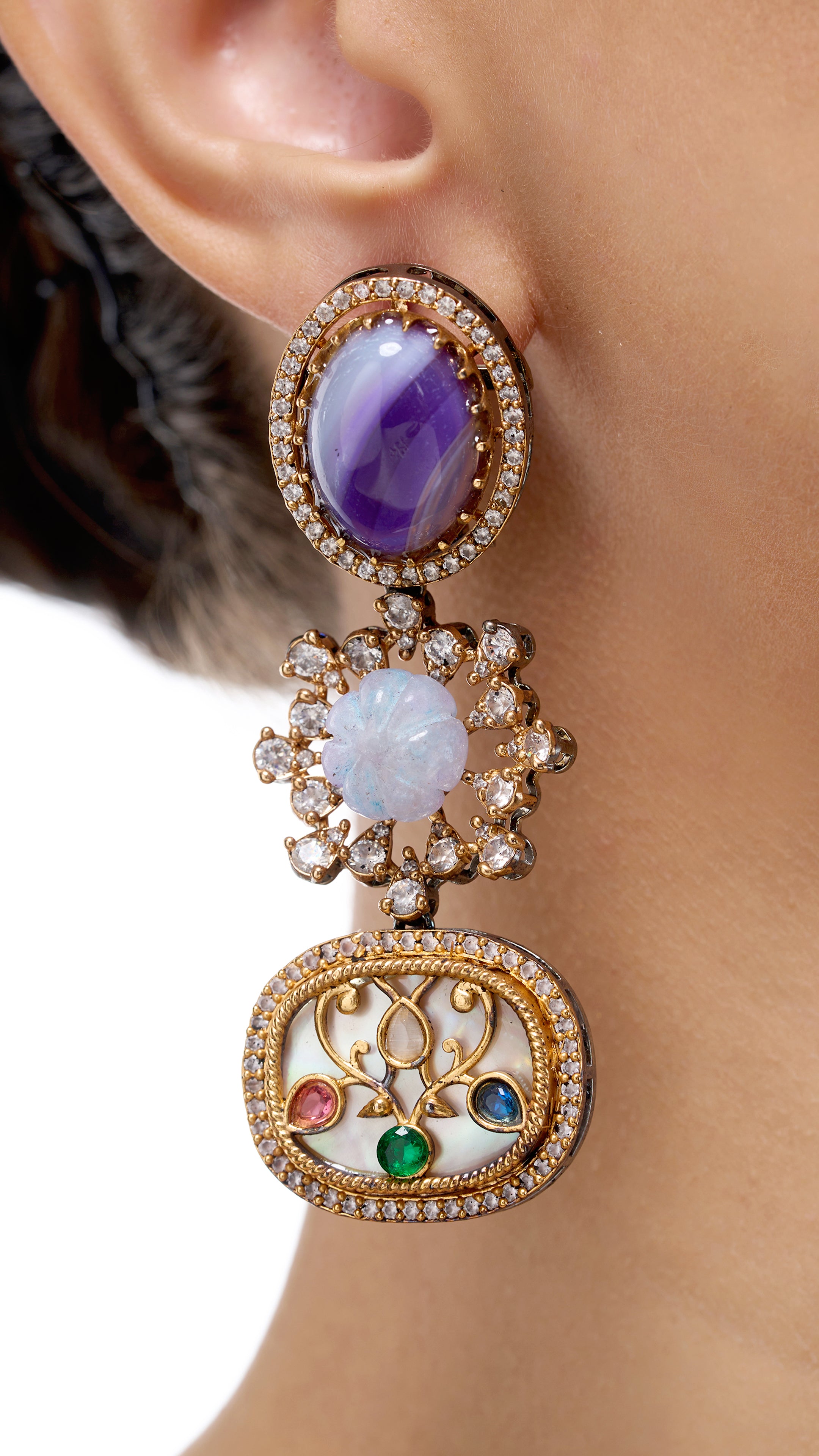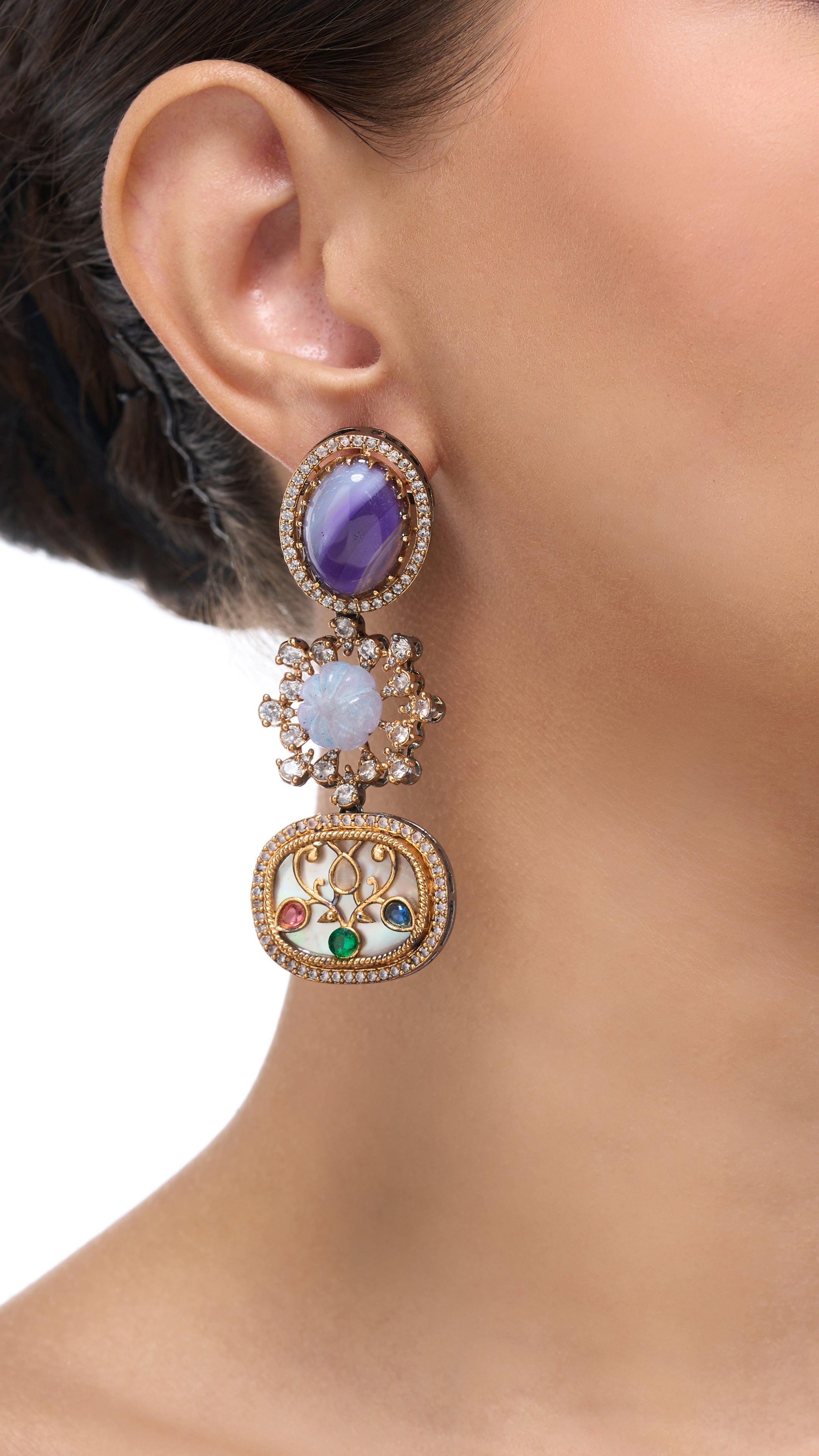 Triple Layer Hand Engraved Earrings on Mother of Pearl in Purple—where artistry meets elegance. These earrings feature three intricately hand-engraved layers set on a lustrous Mother of Pearl base, enhanced by a rich purple hue. The layered design adds depth and sophistication, making them perfect for adding a vibrant, yet refined touch to any outfit. Ideal for special occasions or elevating your everyday style with a blend of traditional craftsmanship and contemporary flair.